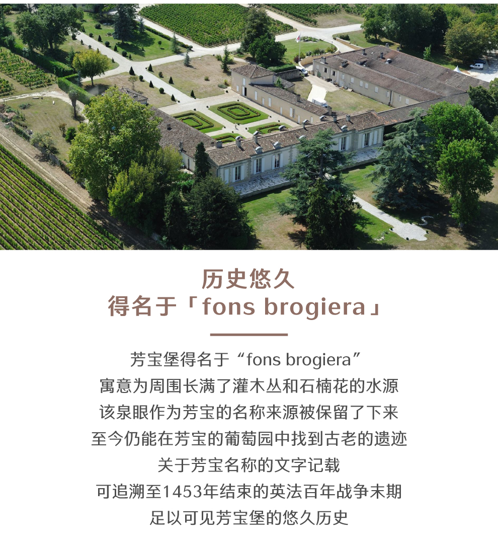 芳宝庄园(Chateau Fombrauge)的名字其实是由“fons brogiera”这两个词组成。fons brogiera,寓意为周围长满了灌木丛和石楠花的水源。这个作为芳宝庄园名称来源地的泉眼一直存在,今天我们仍然可以在芳宝的葡萄园中找到被列为世界遗产的古老洗衣槽(古时欧洲洗衣服都是用泉水)。 芳宝庄园的发展离不开三个家族,卡诺尔家族、仲马家族和挞伐尔家族。关于芳宝这个名字的文献记载最早可以追溯到1453年结束的英法百年战争末期,当时百年战争的最后战役就发生在离圣爱美容几公里的卡斯蒂永•拉巴塔耶地区(Castillon La Bataille)。