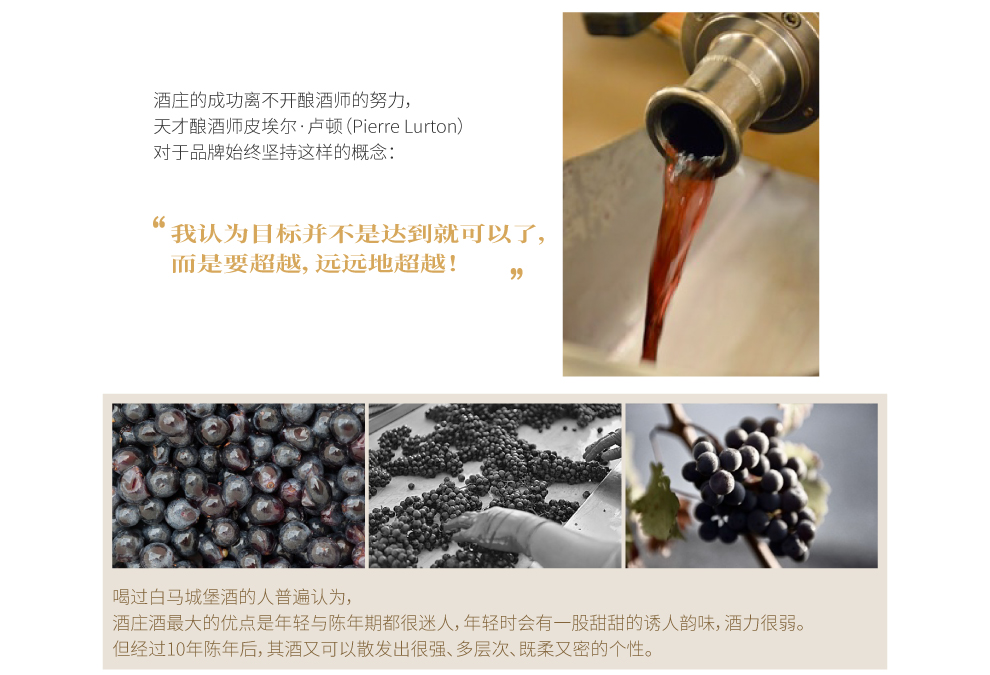 卢顿家族著名的天才酿酒师皮埃尔·卢顿(Pierre Lurton),两座顶级名庄的掌管者对于品牌始终坚持这样的概念:“我认为目标并不是达到就可以了,而是要超越,远远地超越!”