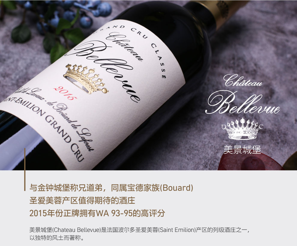 美景酒庄干红葡萄酒(Chateau Bellevue, Saint-Emilion, France)是美景酒庄的正牌干红葡萄酒。休伯特•宝德(Hubert de Bouard)曾指出,美景酒庄的葡萄酒拥有相当高的浓缩度,可称得上是圣爱美容产区的“柏图斯”(Petrus)。