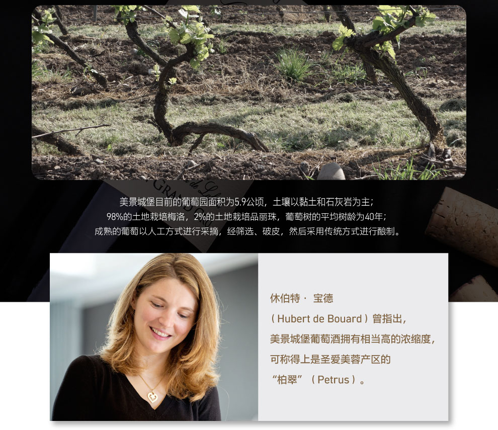 美景酒庄目前的葡萄园面积为5.9公顷,其中有98%的土地用来栽培梅洛(Merlot)葡萄,还有2%的土地用来栽培品丽珠(Cabernet Franc)葡萄,所有这些葡萄树的平均树龄为40年。用来栽培这些葡萄树的土壤为黏土和石灰岩。当葡萄达到理想的成熟状态后,酒庄会通过人工方式进行采摘。采摘后的葡萄经过筛选、破皮后,会通过传统方式进行酿制。