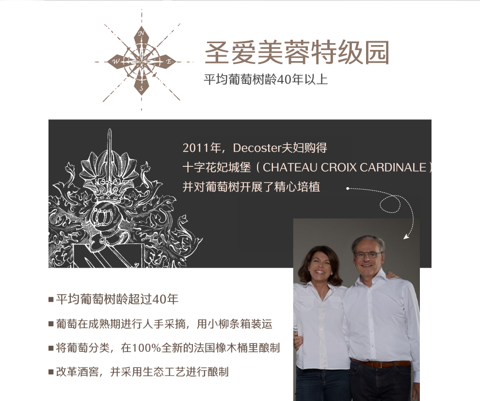 Decoster夫妇于2001年购买了位于圣爱美蓉东部的Fleur Cardinale 城堡, 那里是优良的产区之一。得益于稳定的投资, 无论是葡萄种植还是酒库酿造方面, Fleur Cardinale城堡很快就成为与产地名称相符的佳酿。Fleur Cardinale城堡因其始终如一的质量而著称, 并于2006年晋升为圣爱美蓉列级酒庄。