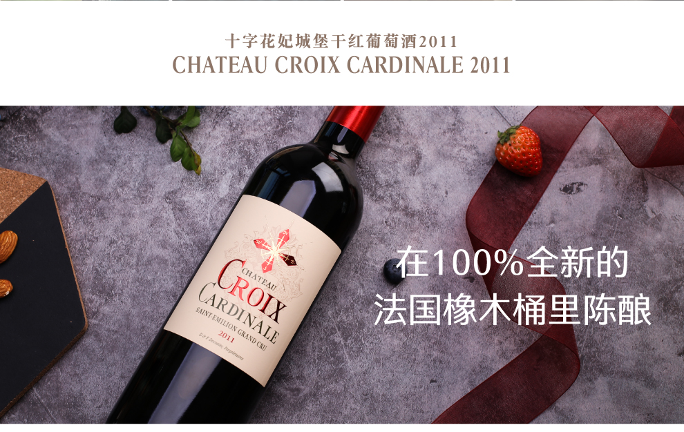十字花妃城堡(Château Croix Cardinale 所用的葡萄产自40年历史的葡萄树, 种植在一片连绵的葡萄园里。 70%的葡萄品种为梅洛, 25%为品丽珠。 这种圣爱美蓉的佳酿是在完全通过生态工艺经改革过的酒库里酿制生产。