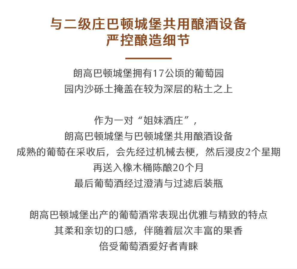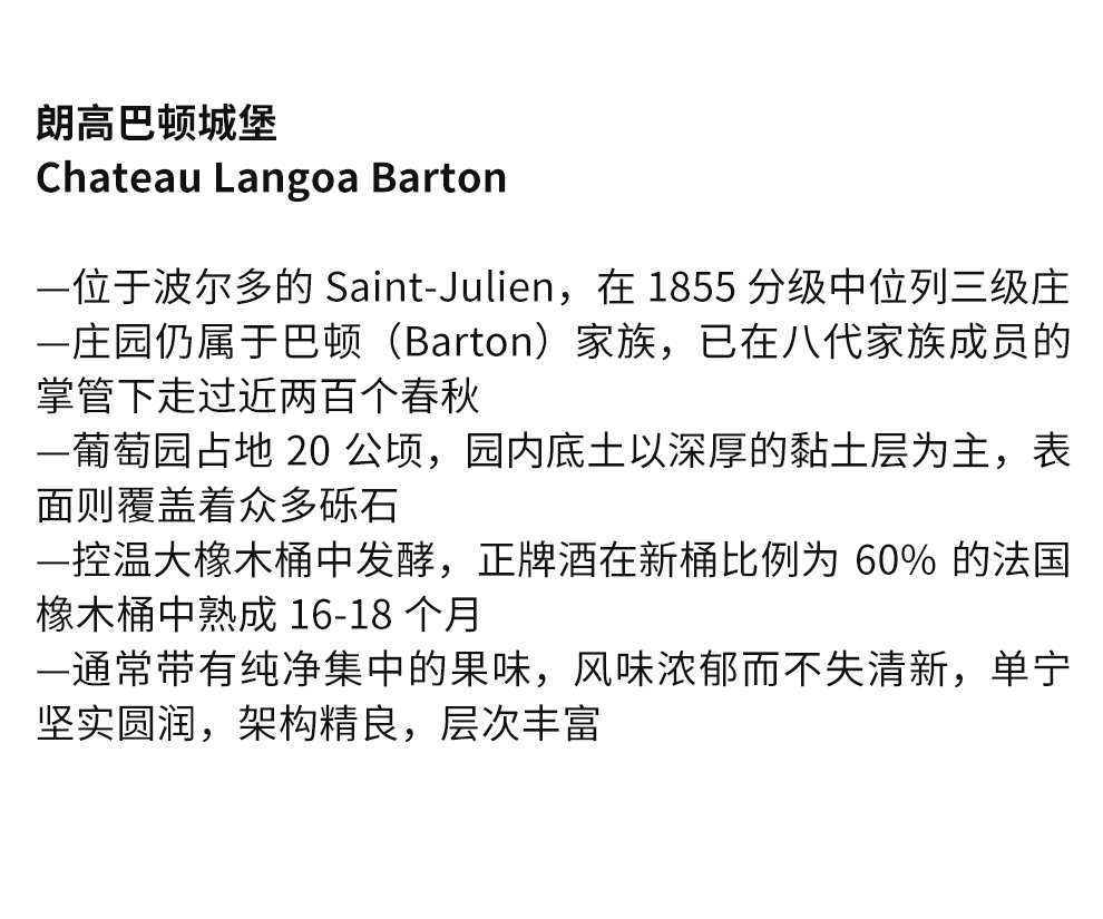 朗高巴顿城堡出产的葡萄酒常表现出优雅与精致的特点,其柔和亲切的口感,伴随着层次丰富的果香,倍受葡萄酒爱好者青睐。