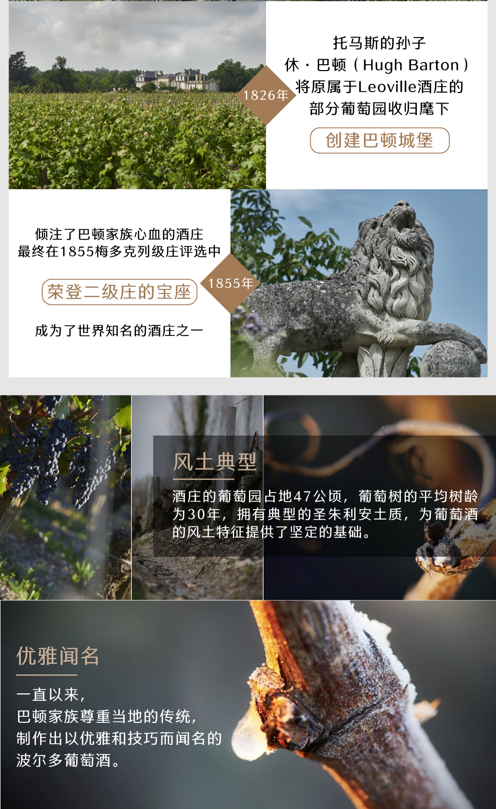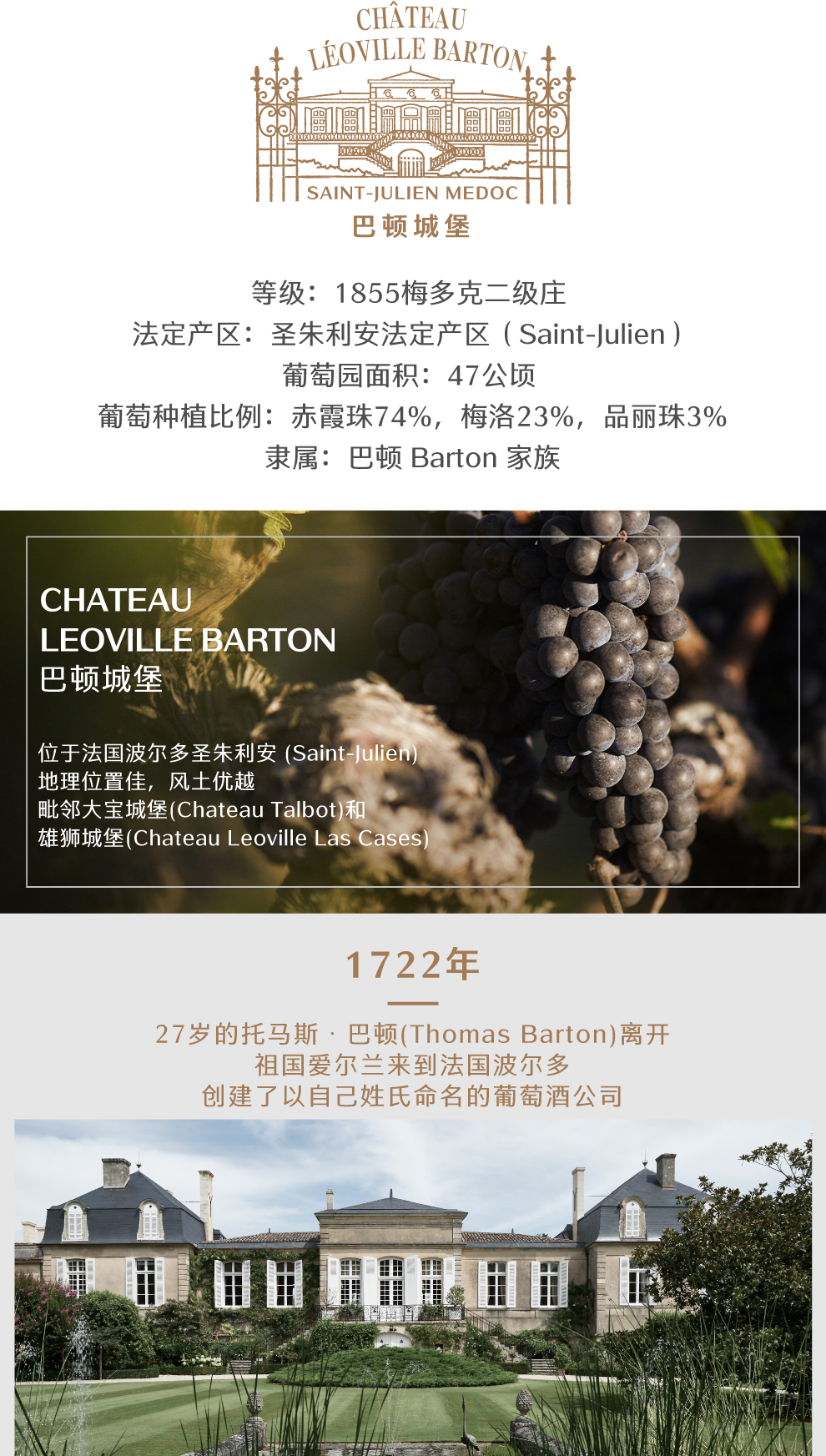 (Chateau Leoville Barton)位于法国波尔多圣朱利安 (Saint-Julien)产区的中心地带,在1855分级中被评为二级庄,与大宝酒庄(Chateau Talbot)和雄狮酒庄(Chateau Leoville Las Cases)相邻。