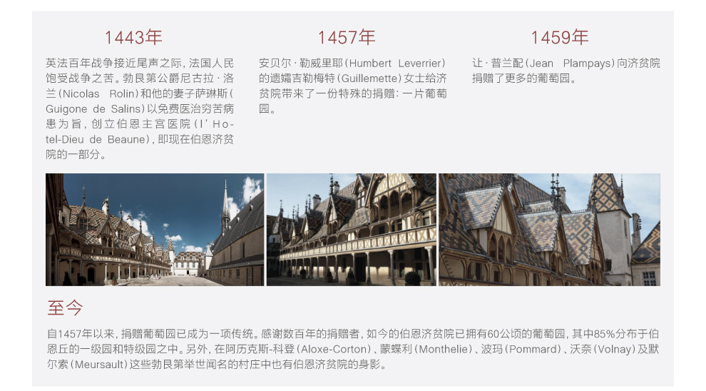 在英法百年战争接近尾声的1443年,法国人民终日为苦难和饥饿所困。这时,勃艮第公爵、“好人菲利普”的宰相大臣尼古拉•洛兰(Nicolas Rolin)和他的妻子萨琳斯(Guigone de Salins)以免费医治穷苦病患为旨,于1443年创立了伯恩主宫医院(l’Hotel-Dieu de Beaune),即现在伯恩济贫院的一部分。1457年,安贝尔•勒威里耶(Humbert Leverrier)的遗孀吉勒梅特(Guillemette)给济贫院带来了一份特殊的捐赠:一片葡萄园。1459年,让•普兰配(Jean Plampays)向济贫院捐赠了更多的葡萄园。在随后的几个世纪以来,捐赠葡萄园的传统得以延续至今。