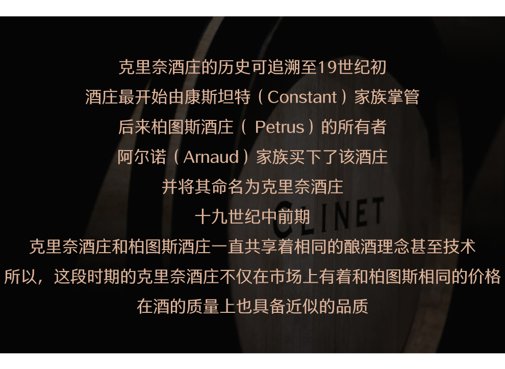 克里奈酒庄的历史可追溯至19世纪初。酒庄最开始由康斯坦特(Constant)家族掌管,后来柏图斯酒庄( Petrus)的所有者阿尔诺(Arnaud)家族买下了该酒庄,并将其命名为克里奈酒庄。十九世纪中前期,克里奈酒庄和柏图斯酒庄一直共享着相同的酿酒理念甚至技术,所以,这段时期的克里奈酒庄不仅在市场上有着和柏图斯相同的价格,在酒的质量上也具备近似的品质。