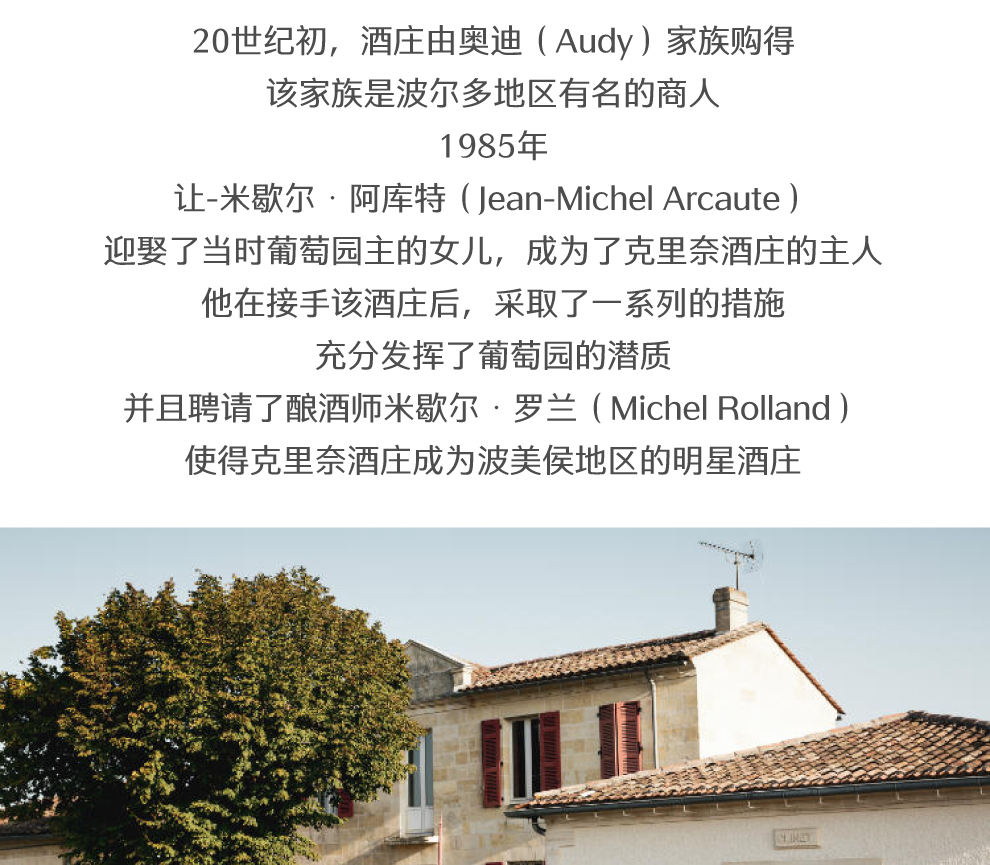 20世纪初,酒庄由奥迪(Audy)家族购得。该家族是波尔多地区有名的商人。1985年,让-米歇尔•阿库特(Jean-Michel Arcaute)迎娶了当时葡萄园主的女儿,成为了克里奈酒庄的主人。他在接手该酒庄后,采取了一系列的措施,充分发挥了葡萄园的潜质,并且聘请了酿酒师米歇尔•罗兰(Michel Rolland),使得克里奈酒庄成为波美侯地区的明星酒庄。