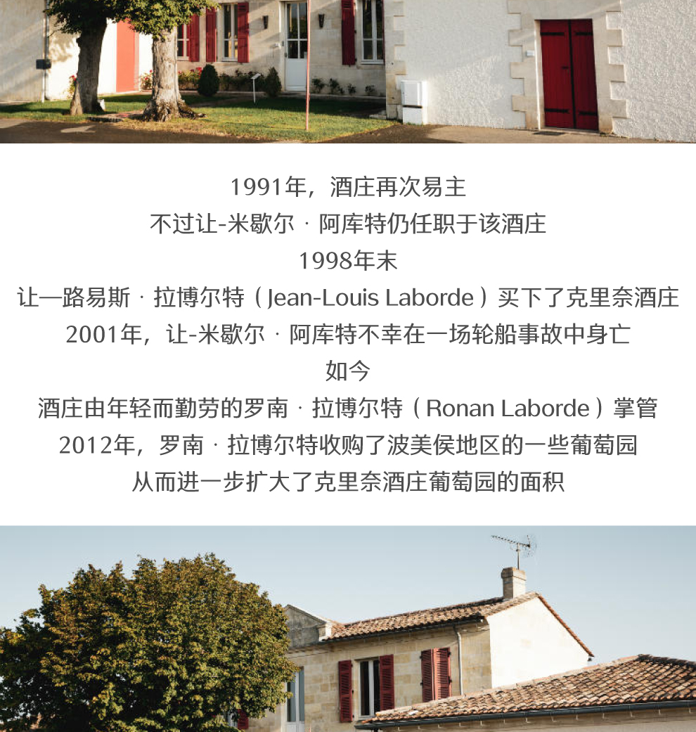 1991年,酒庄再次易主,不过让-米歇尔•阿库特仍任职于该酒庄。1998年末,让—路易斯•拉博尔特(Jean-Louis Laborde)买下了克里奈酒庄。2001年,让-米歇尔•阿库特不幸在一场轮船事故中身亡。如今,酒庄由年轻而勤劳的罗南•拉博尔特(Ronan Laborde)掌管。2012年,罗南•拉博尔特收购了波美侯地区的一些葡萄园,从而进一步扩大了克里奈酒庄葡萄园的面积。