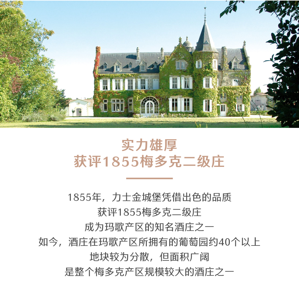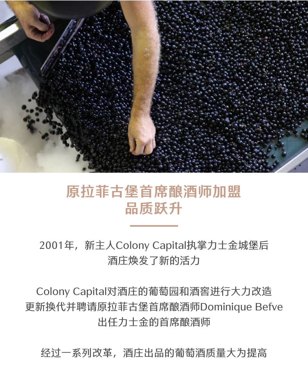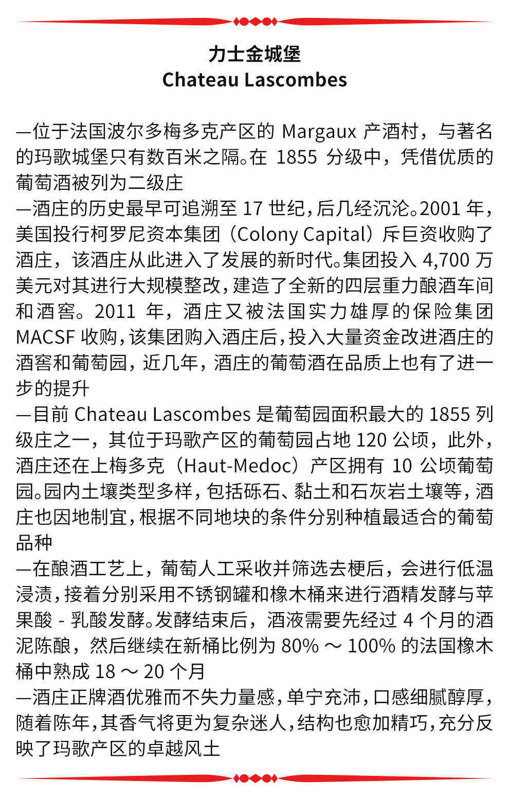 Lascombes 为波尔多1855年梅多克二级酒庄,也是梅多克(Medoc)区面积最大的酒庄之一,所拥有的地块十分的分散,在玛歌(Margaux)产区拥有大约40 个以上的酒园。 Lascombes 由赤霞珠(Cabernet Sauvignon)梅洛( Merlot) 小维尔多(Petit Verdot) 混合酿成,并在60% 新橡木桶中醇化18个月。酒庄风格以出产典雅均衡且充满黑醋栗果味的酒款闻名,陈年后更加深其复杂度。2001 年延续2000 年的成功,在 Yves Vatelot (Ch. Reignac) 及Dr. Alain Raynaud (Ch. Quinault l’Enclos) 的指导下持续酿造出绝佳的质量。酒中含有圆润的花香、蓝莓、黑莓以及黑茶子香气,甜美的单宁以及令人印象深刻的集中度。尾韵十分悠长。发酵前处理在8℃下持续一个星期;28℃下酒精发酵,30℃下浸皮;在橡木桶中进行苹果乳酸发酵,温度控制在21℃;正牌酒和副牌酒都要带酒槽熟化4个月 ;每三个月通过压缩空气进行一次滗析;使用传统的蛋清澄清法。在橡木桶中陈酿18-20个月。