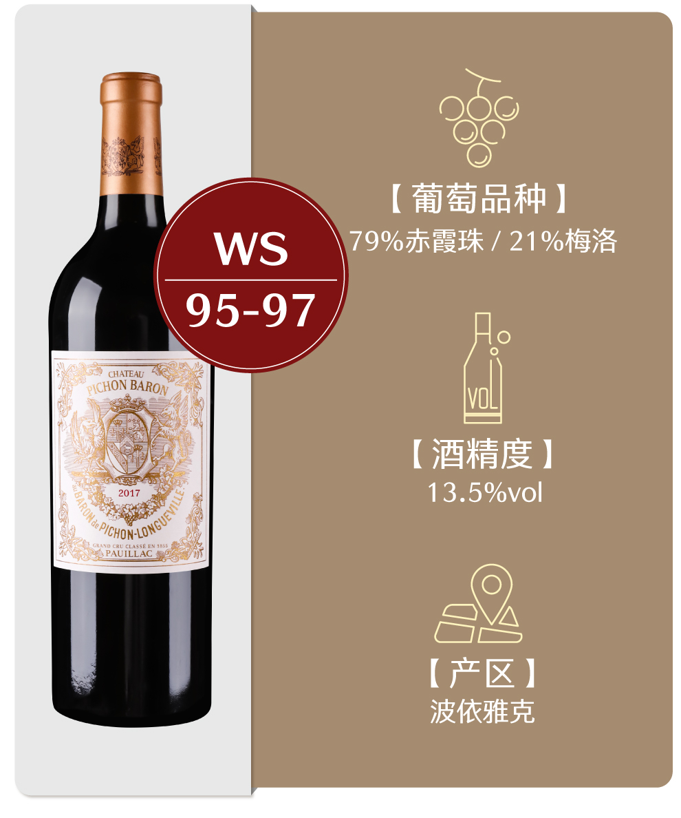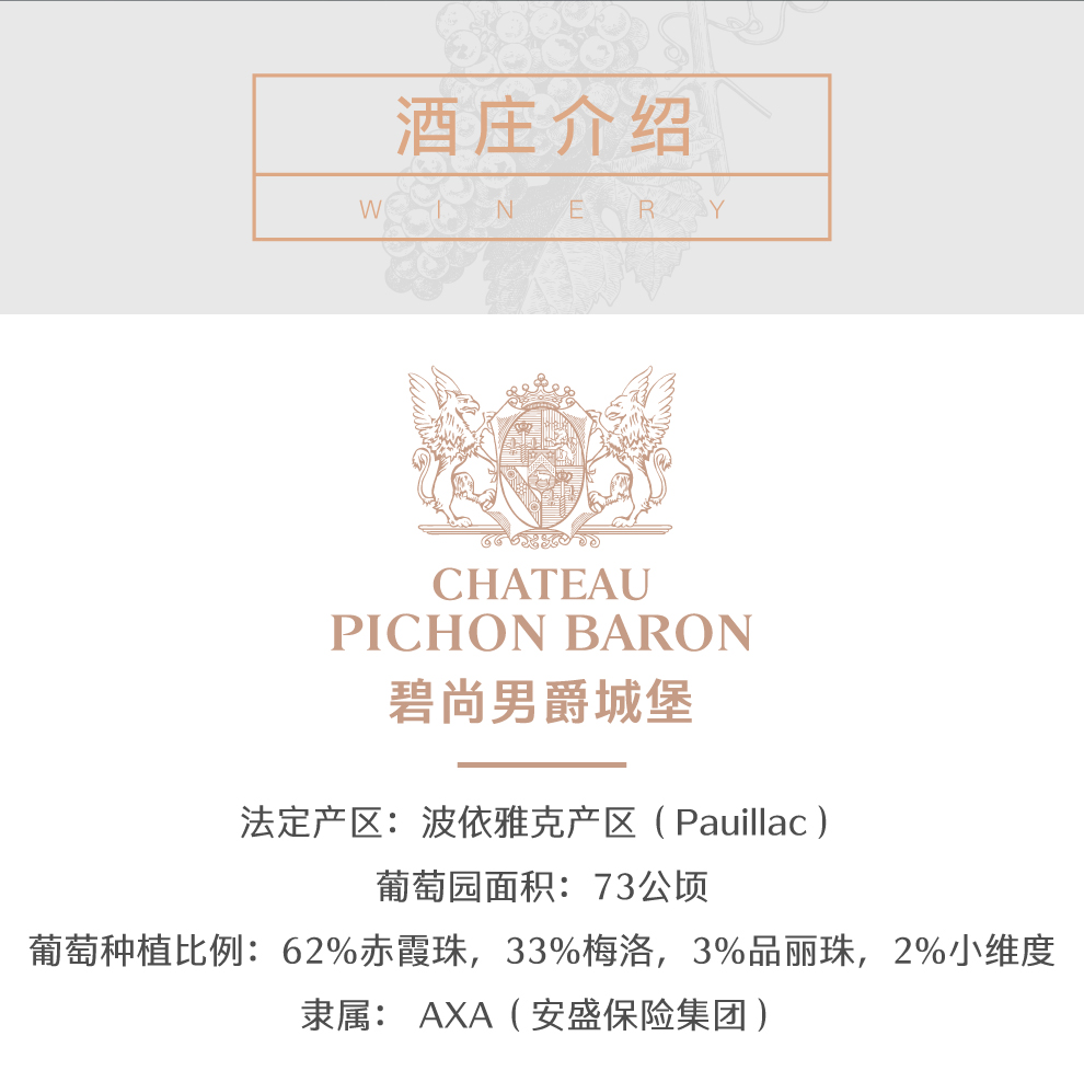 男爵古堡的正牌酒风格优雅而富有力量,能够展现出波雅克的浓郁与复杂,风味十分丰富,单宁成熟且强劲,具有较强的陈年潜力。此外,酒庄还生产两款副牌酒,分别为男爵古堡副牌红葡萄酒(Les Tourelles de Longueville)及男爵古堡狮鹫红葡萄酒(Les Griffons de Pichon Baron)。这两款副牌酒风格活泼,同样也具有迷人的特质,它们一般更适宜早饮。