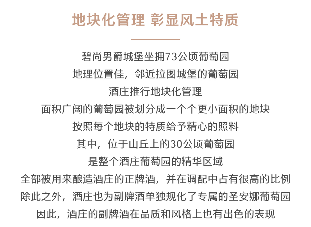 酒庄的管理团队对葡萄园的打理十分细致,他们认真而严谨地对待每一个步骤,以确保酿酒葡萄的品质。酒庄葡萄园的种植密度为9,000株/公顷,每一葡萄地块的产量根据葡萄藤的树龄及葡萄品种进行控制。在管理葡萄园时,酒庄尊重自然。为了保证葡萄的最佳状态,酒庄采用人工的方式采摘葡萄,经过层层筛选,成熟度最佳的葡萄才能用于酿造葡萄酒。