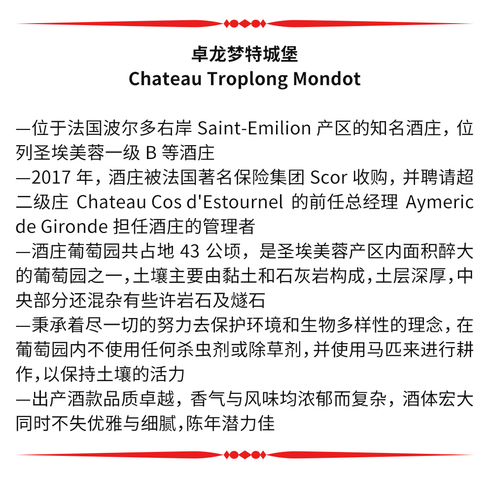 1850年,法国颇有名望的参议员雷蒙·卓龙(Raymond Troplong)先生购下卓龙梦特城堡。在其掌管期间,酒庄的葡萄园面积逐步扩张至如今的规模,酒庄名字中的“卓龙(Troplong)”便是来自这位庄主。此后,酒庄历经两次转手,于1936年迎来第四任主人亚历山大·瓦莱特(Alexandre Valette)先生。接下来的80余年里,卓龙梦特城堡一直为瓦莱特(Valette)家族所有。在瓦莱特家族的历任掌门人中,克里斯汀·瓦莱特-帕瑞特(Christine Valette-Pariente)是贡献最大的管理者之一。克里斯汀于20世纪80年代初接管酒庄后,便大刀阔斧地开展了一番改革:实现人工采收;拔除此前栽种的马尔贝克(Malbec)葡萄树;推迟葡萄采收时间并降低葡萄产量,以增加最终成酒的集中度等。而在酒窖中,酿酒葡萄的筛选分拣过程变得更为严格;在酿酒容器中加入温控系统;在葡萄酒的陈酿过程中增加新法国橡木桶的比例等。这一系列举措成效卓著,使卓龙梦特城堡葡萄酒的品质日益上升,而卓龙梦特城堡也迅速成为波尔多右岸的知名酒庄。