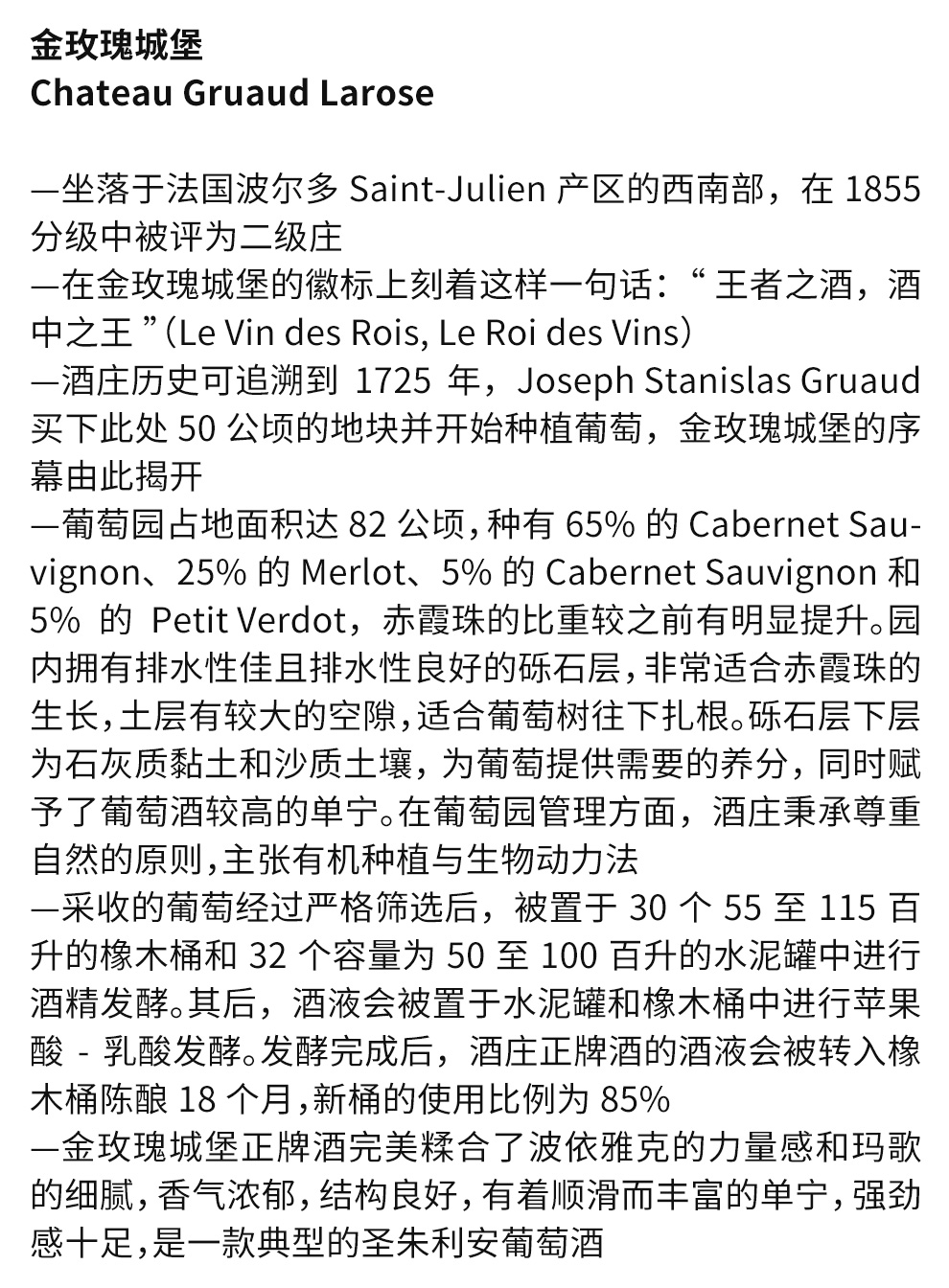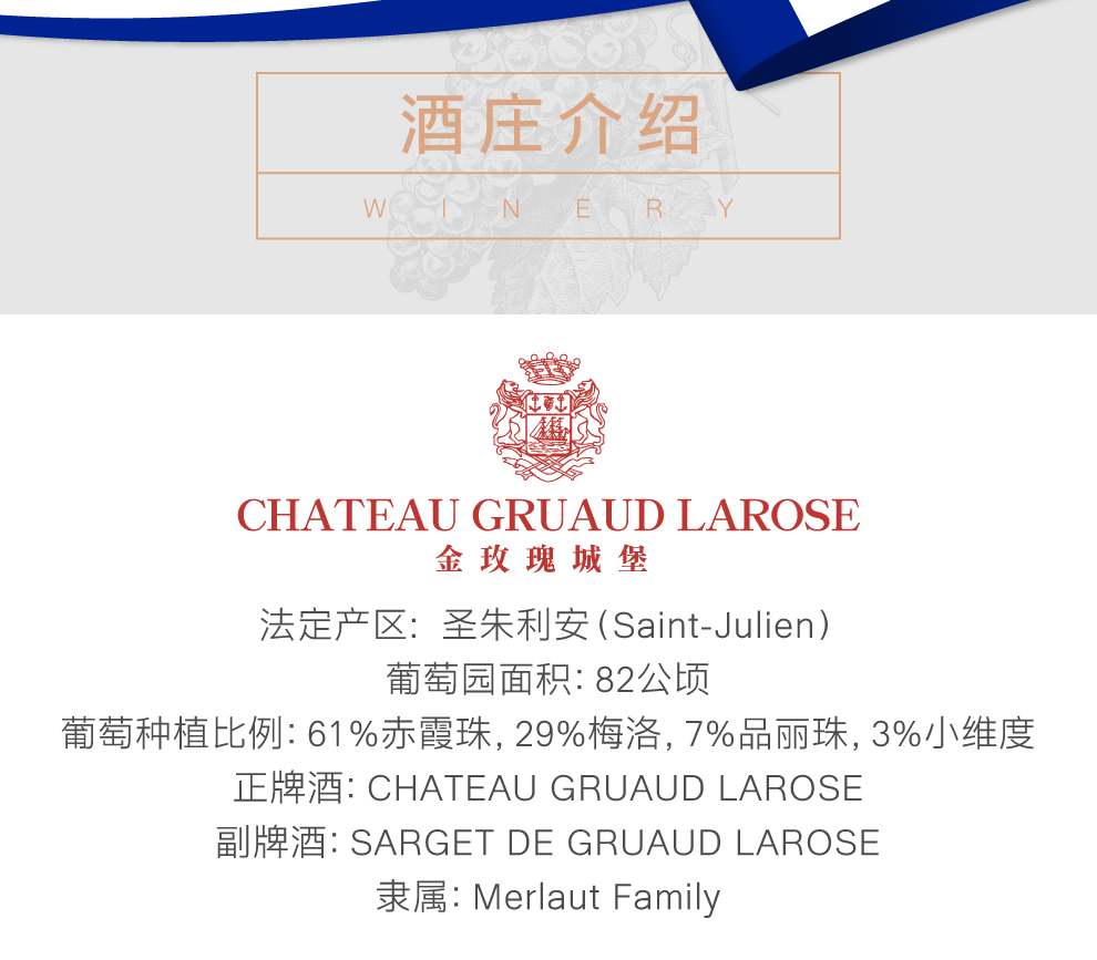1855年梅多克分级二级庄Chateau Gruaud Larose位于波尔多左岸Saint Julien, 城堡于1725年建立, 而1791年时才正式有了Gruaud Larose这个名字, 几百年来因财产继承以及买卖等过程, 城堡所有权分分合合, 1917年Cordier家族先买下当时一分为二的Chateau Gruaud Larose其中一半的所有权-Gruaud Larose Sarget, 并于1935买下另一半Gruaud Larose Bethmann, 直到此时Chateau Gruaud Larose终于结束百多年来的分裂, 在Cordier家族的致力经营之下, 也出现了极为精采的1961年份, 以及1962, 1966, 1970年等佳酿。1970年开始酒庄引进新的技术团队, 由技术总监Georges Pauli领军, 1983年苏伊士Suez集团入主, 1993年又转手到艾卡特·艾斯森Alcatel Alsthom集团旗下, 引进计算机管理以及许多新科技, 并扩大厂房及更新酒窖设备, 使Chateau Gruaud Larose更为现代化, 1997年Merlaut家族入主, 现今庄主为Jean Merlaut, 1970年代开始虽然酒庄数度易主, 但仍由Georges Pauli执掌的技术团队负责酿酒。