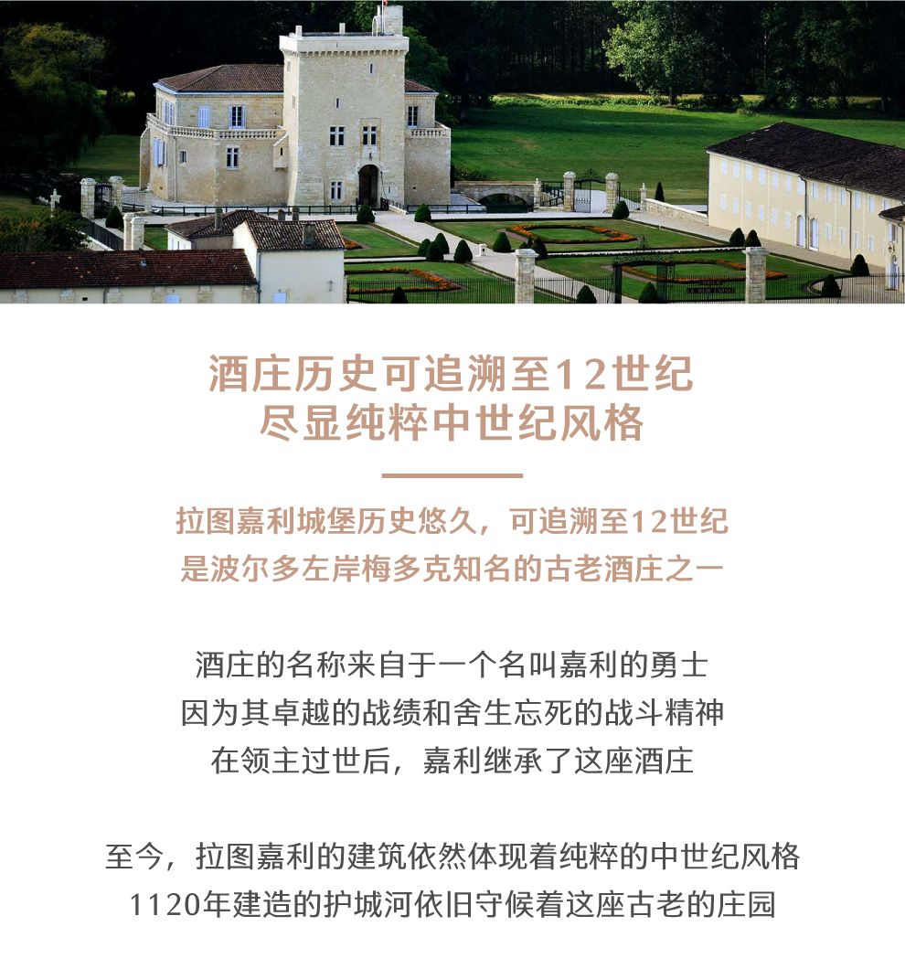 拉图嘉利城堡历史可上溯到十二世纪,是梅多克最古老的酒庄之一。其建筑体现了纯粹的中世纪风格,城楼和1120年建造的护城河都证明了这一点。拉图嘉利庄园是梅多克中少数几个真正能称得上“城堡庄园”的酒庄之一,而它实际上就是一座城堡。