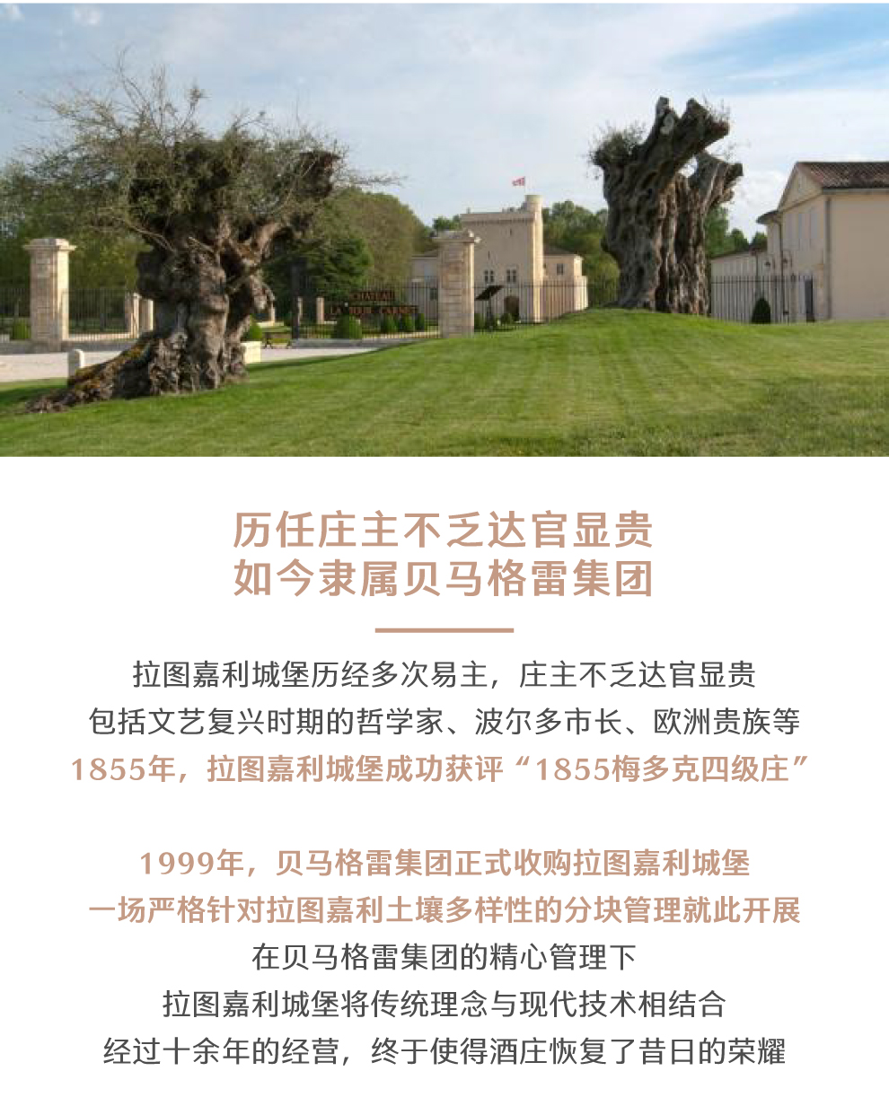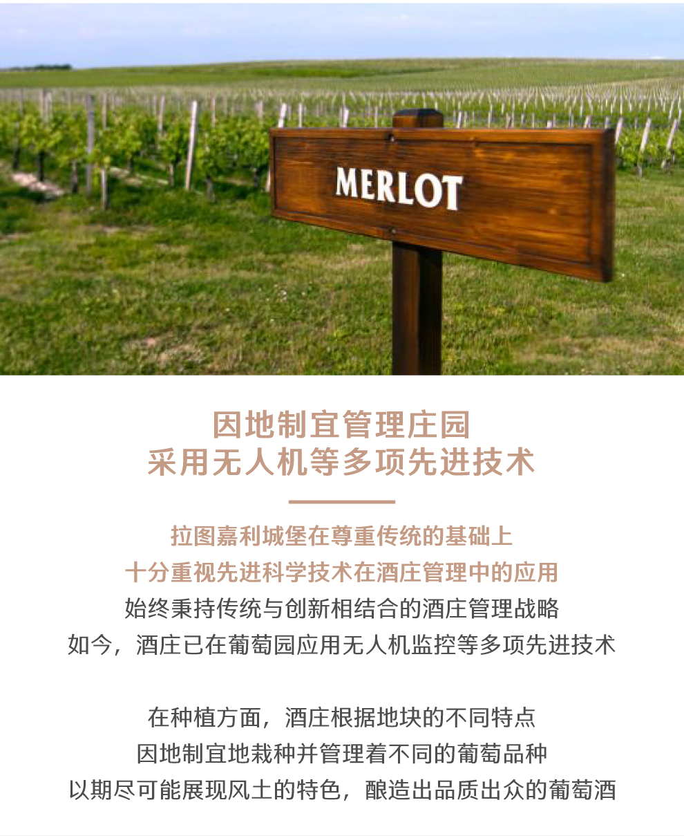 拉图嘉利于1999年被大名鼎鼎的酒商BernardMagrez贝尔纳.马格雷买下,更为严格的针对拉图嘉利土壤土质多样性的分块管理从此展开。尊重环境放弃除草和土壤改良,把重心放在提高作物潜能的种植酿酒哲学,保住了拉图嘉利名酒的声誉,更是将传统的方法和现代技术优化结合,精细灵活与差异性并存,毫无疑问地将拉图嘉利的盛名远播在外。10年后的2009年份拉图嘉利更是达到一个里程碑高峰。