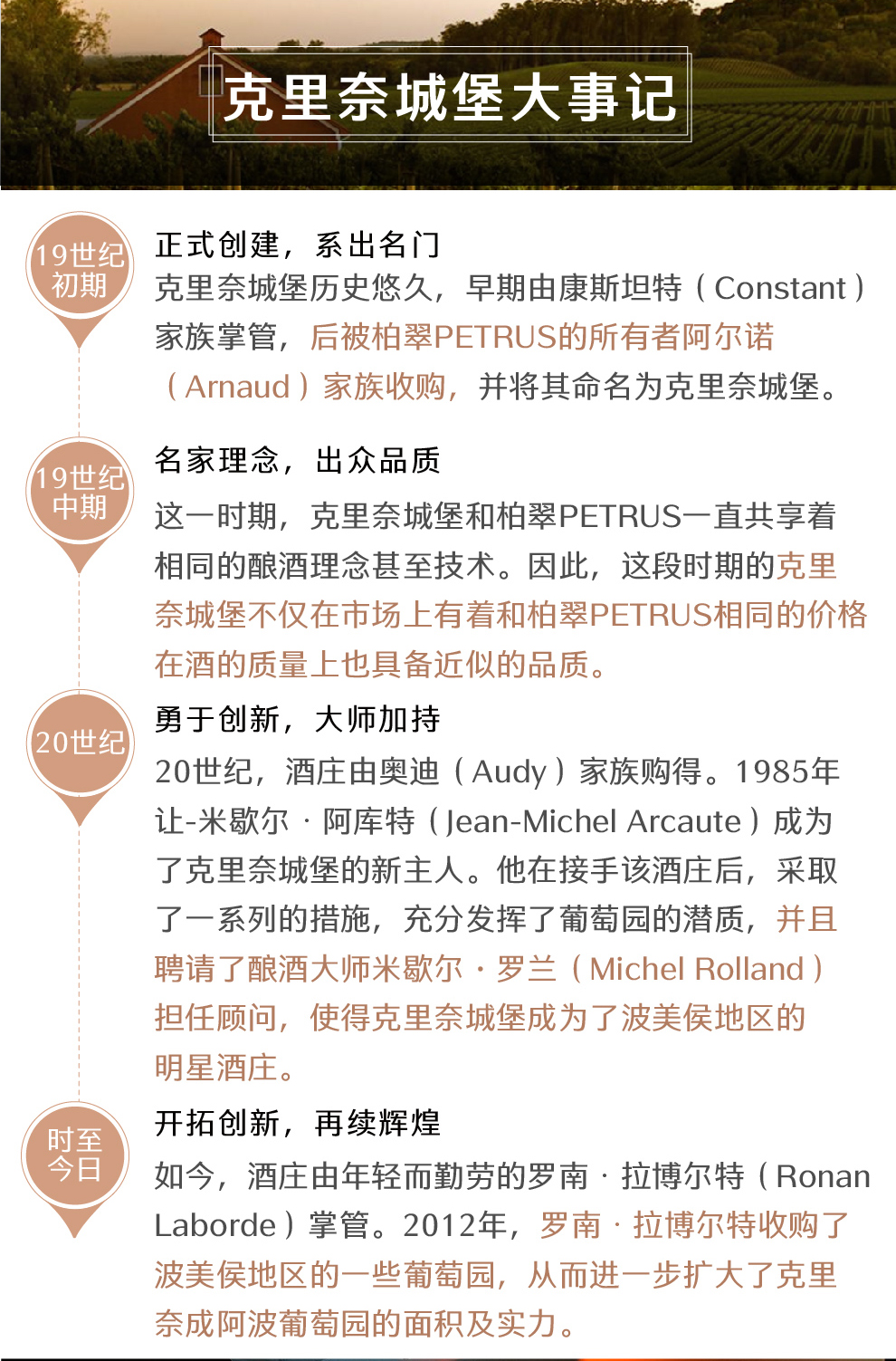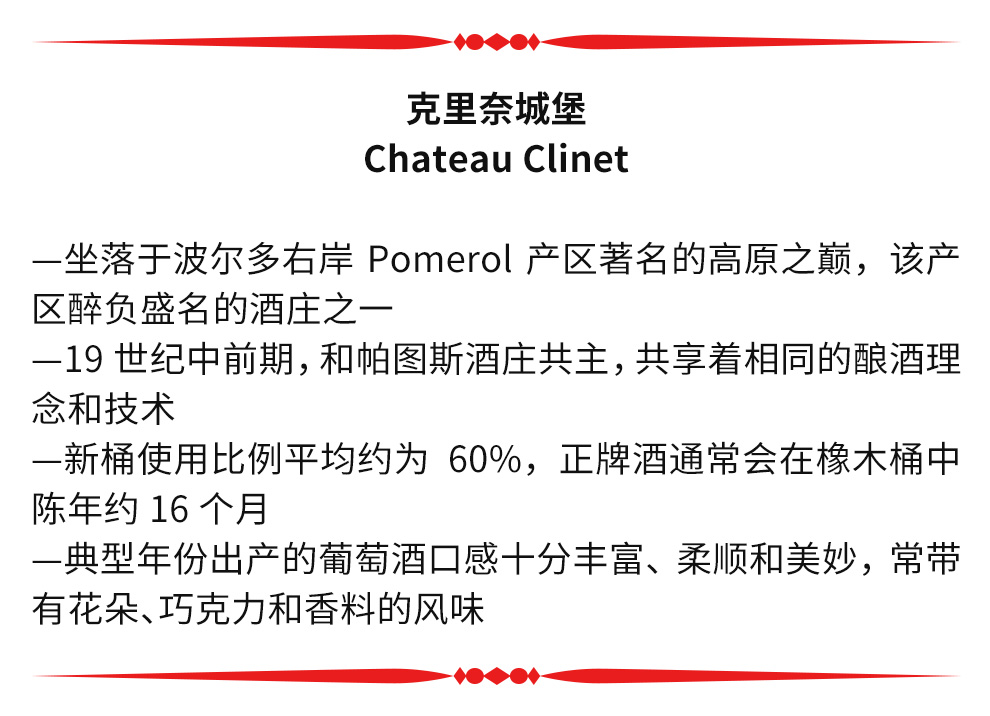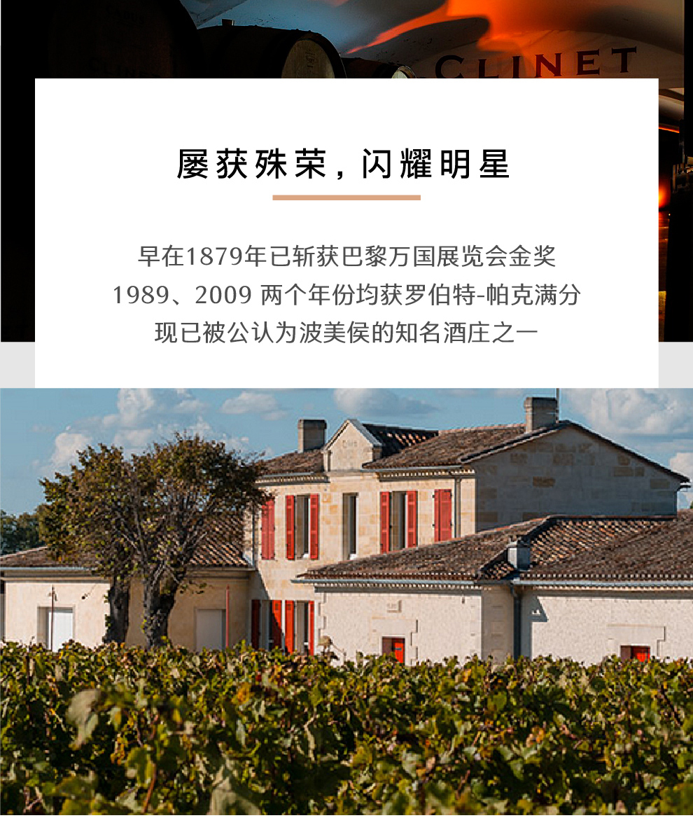 酒庄名称“Clinet 克里奈”在1785年Belleyme 地图上也读做“Cliné 克里内”,从词源学角度来说,这个词由古语“Cliner”一词衍生而来,意为“弓”或“倾斜”,也许是斜坡的象征:著名的波美侯高原。