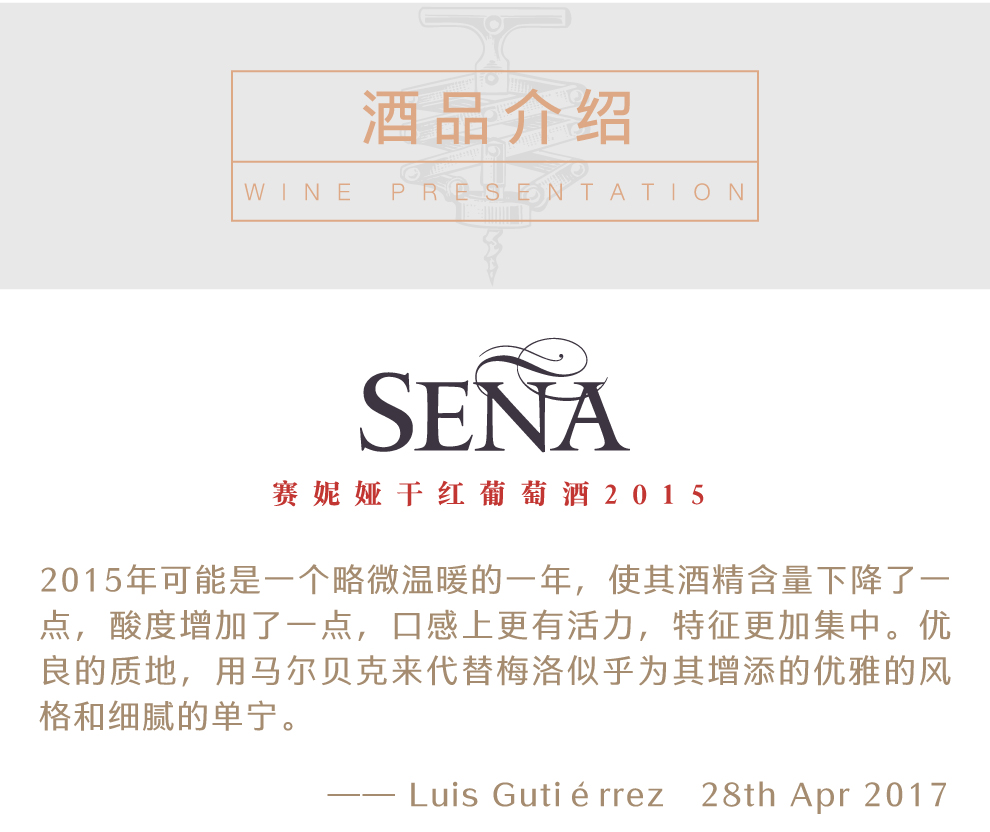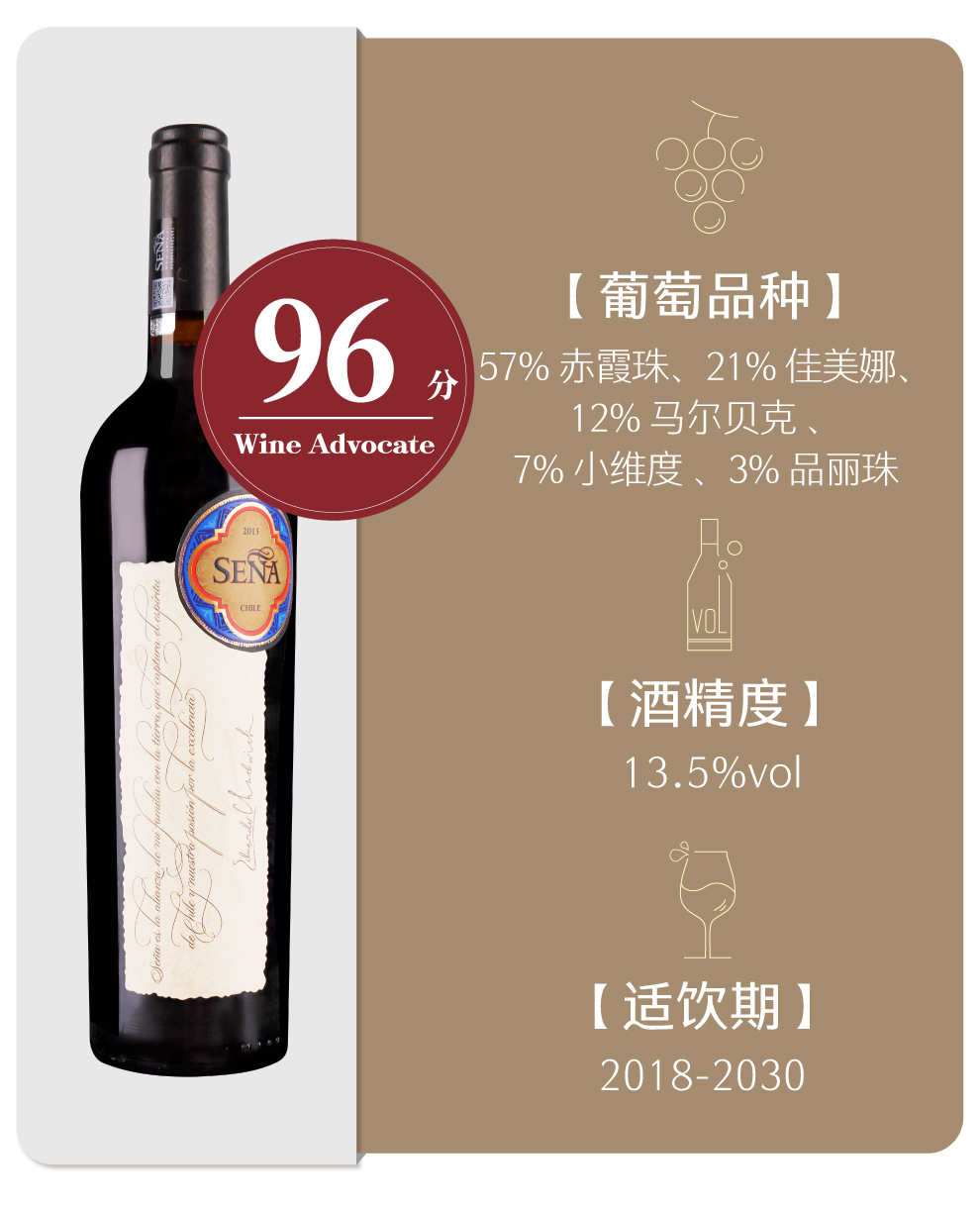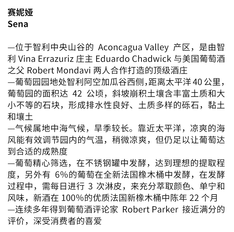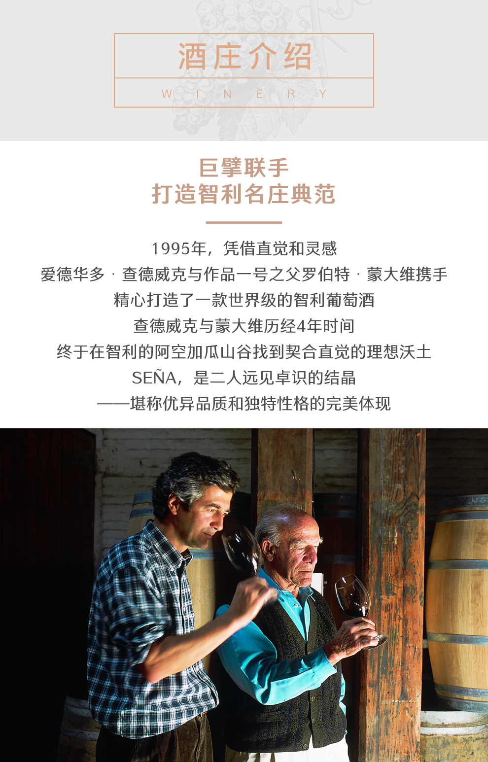 (Sena)位于智利的阿空加瓜谷(Aconcagua Valley)产区,是由智利伊拉苏酒庄(Vina Errazuriz)的庄主爱德华多·查威克(Eduardo Chadwick)与美国葡萄酒之父罗伯特·蒙大维(Robert Mondavi)两人合作打造的顶级酒庄。