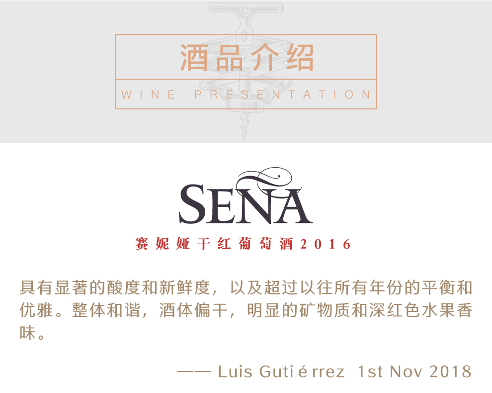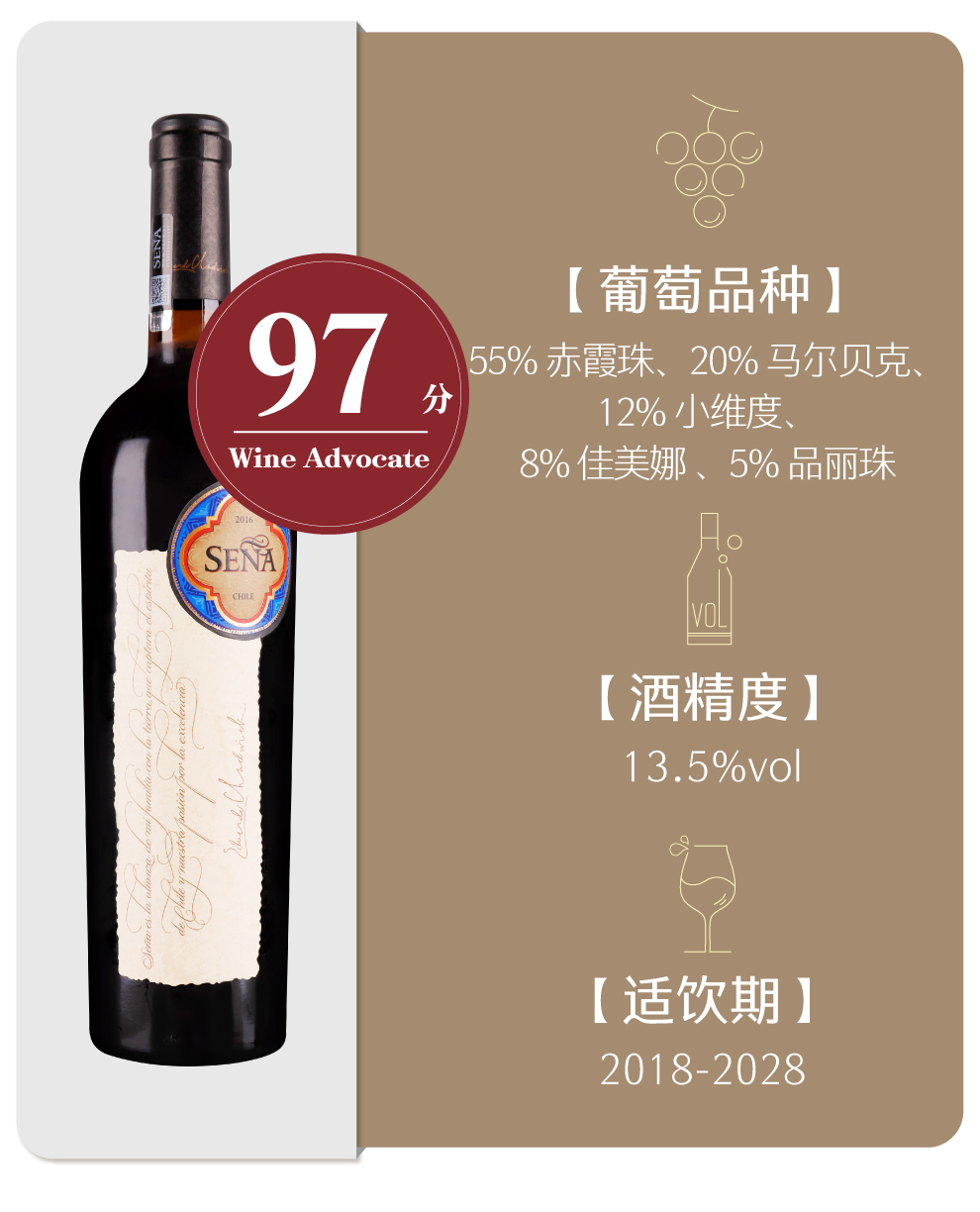 (Sena)位于智利的阿空加瓜谷(Aconcagua Valley)产区,是由智利伊拉苏酒庄(Vina Errazuriz)的庄主爱德华多·查威克(Eduardo Chadwick)与美国葡萄酒之父罗伯特·蒙大维(Robert Mondavi)两人合作打造的顶级酒庄。