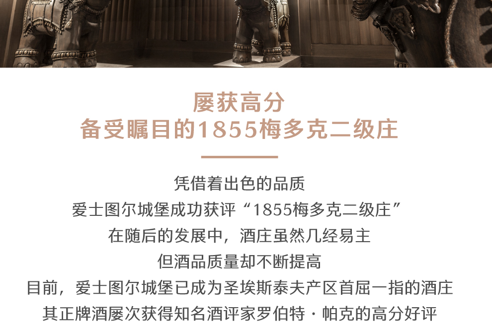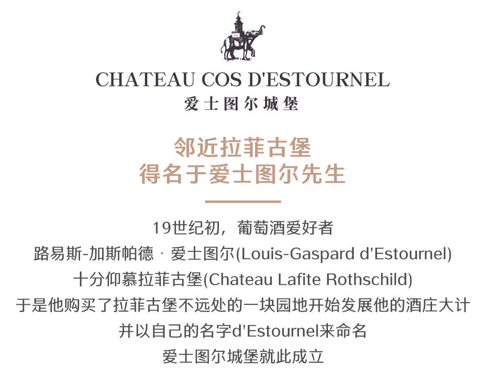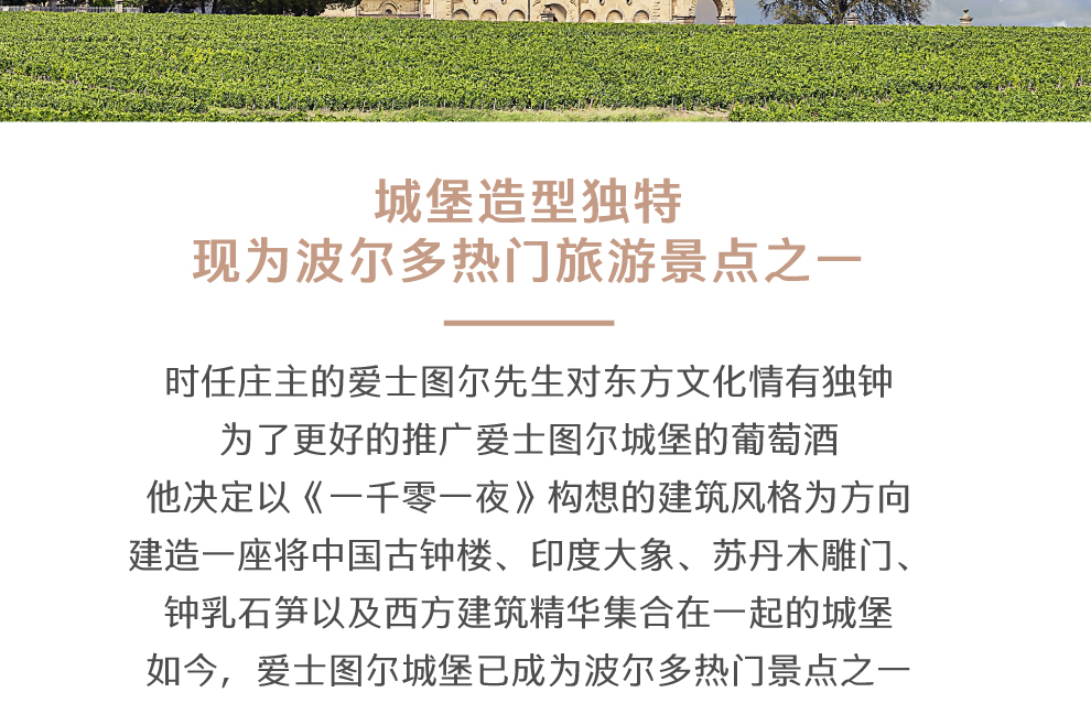 爱士图尔庄园闻名遐迩的城堡建筑同样出自创始人路易斯之手。对东方文化涉猎颇深且十分喜爱的路易斯别出心裁地将众多东方元素融合进酒庄城堡的设计中。他在酒庄城堡之上建造了雄伟的印度宝塔,宝塔之下则为华丽精美的酒窖,为爱士图尔庄园点缀上绮丽而沉静的东方色彩。此外,他还特意从桑给巴尔(Zanzibar)运回一道苏丹宫殿大门,并在城堡各处雕刻上象征着智慧的印度大象,将酒庄打造成“献给葡萄酒的一座豪华宫殿”,路易斯本人也因此被人们称为“圣埃斯泰夫大君(Maharajah of Saint-Estephe)”。如今,爱士图尔这座独具东方古韵的城堡已成为波尔多最热门的景点之一。