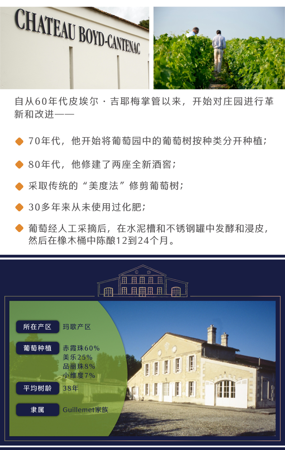 Boyds家族是贝尔法斯特地区的经商家族,起源于苏格兰,在国际关系和出口贸易方面起到重要经济作用。1754年,Jacques Boyd在Cantenac地区买下此庄园并冠以家族之名。1855年该庄园获得了三级庄的荣耀,享誉全球。1932年,Guillemet家族购得庄园。