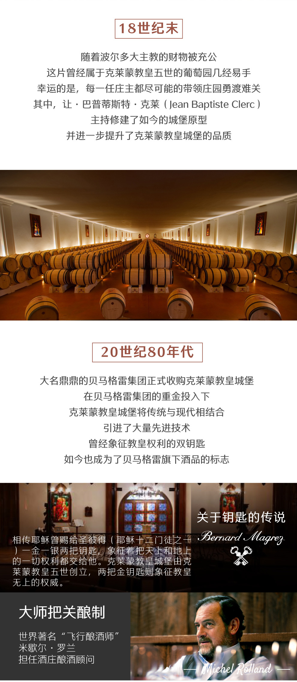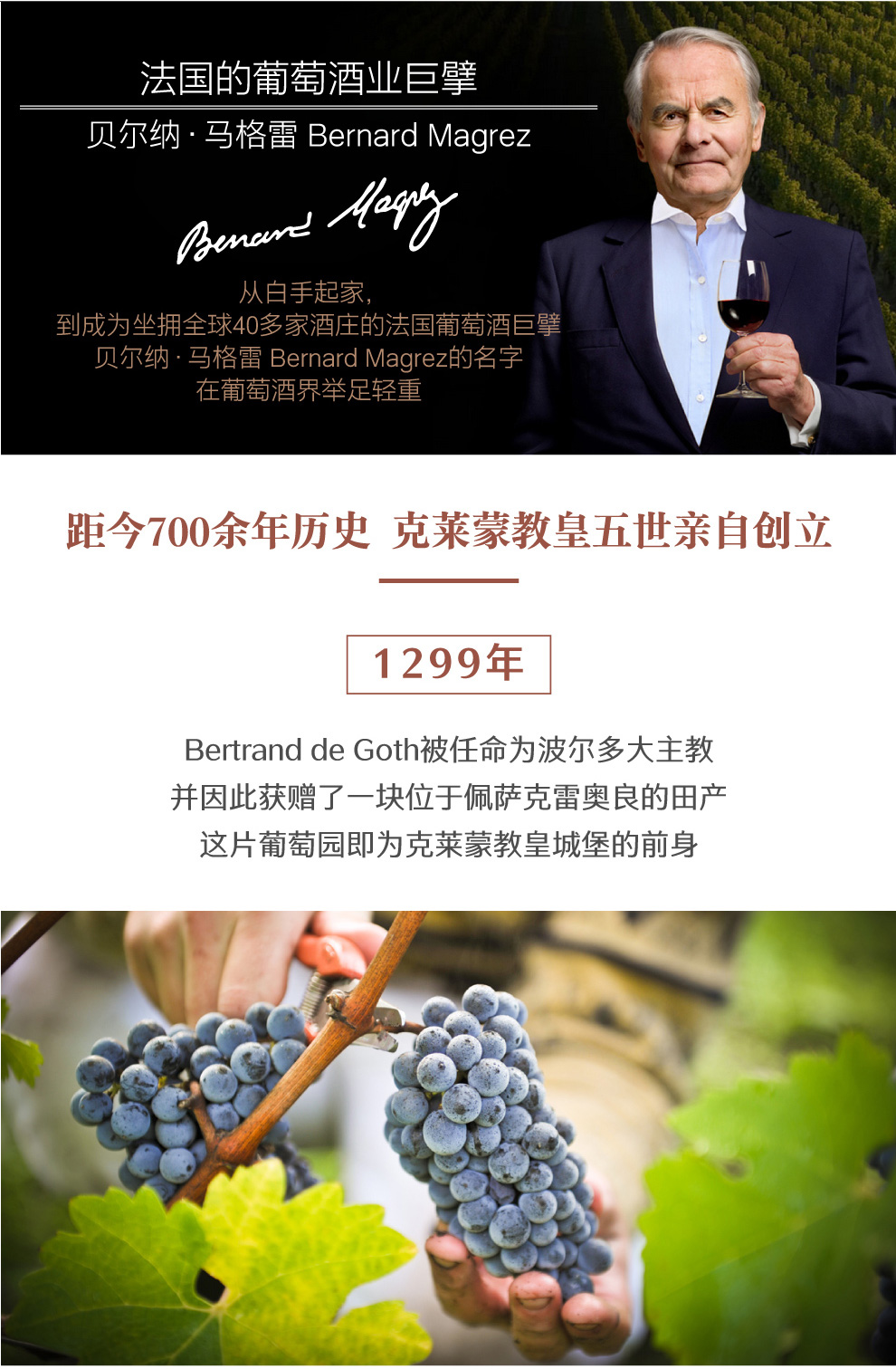 这里不得不提到让·巴普蒂斯特·克莱(Jean Baptiste Clerc)这名波尔多葡萄酒批发商,他于1858年购置这一产地,并将其打造成一个模范葡园。在他的管理下,有着细腻口感的克莱蒙教皇葡萄酒在1878年的世博会中分别摘得纪隆德农业协会金奖和农业部特级金奖,这两项荣誉很好地稳固了葡萄酒的知名度。