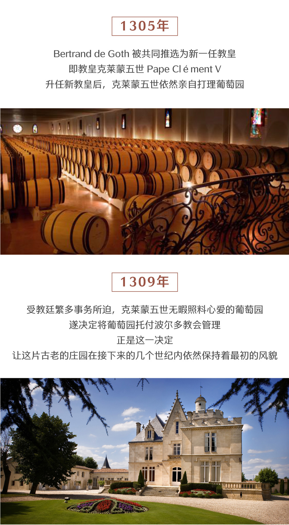 1305至1309年,教皇继续管理自己的葡萄园,这也由此成为他的一项专长。但受教廷繁多的事务所迫,教皇无法继续精心操持葡萄园,所以1309年12月12日,他决定将这块产地赠予当时的波尔多大主教阿尔诺·德·康特鲁(Arnaud de Canteloup)。将葡园托付给波尔多教会管理,这无疑是克莱蒙五世所想到的能让葡园永世传承的最好方法,正因如此,克莱蒙教皇的葡萄园得以在接下来的几个世纪内保持最初的风貌。