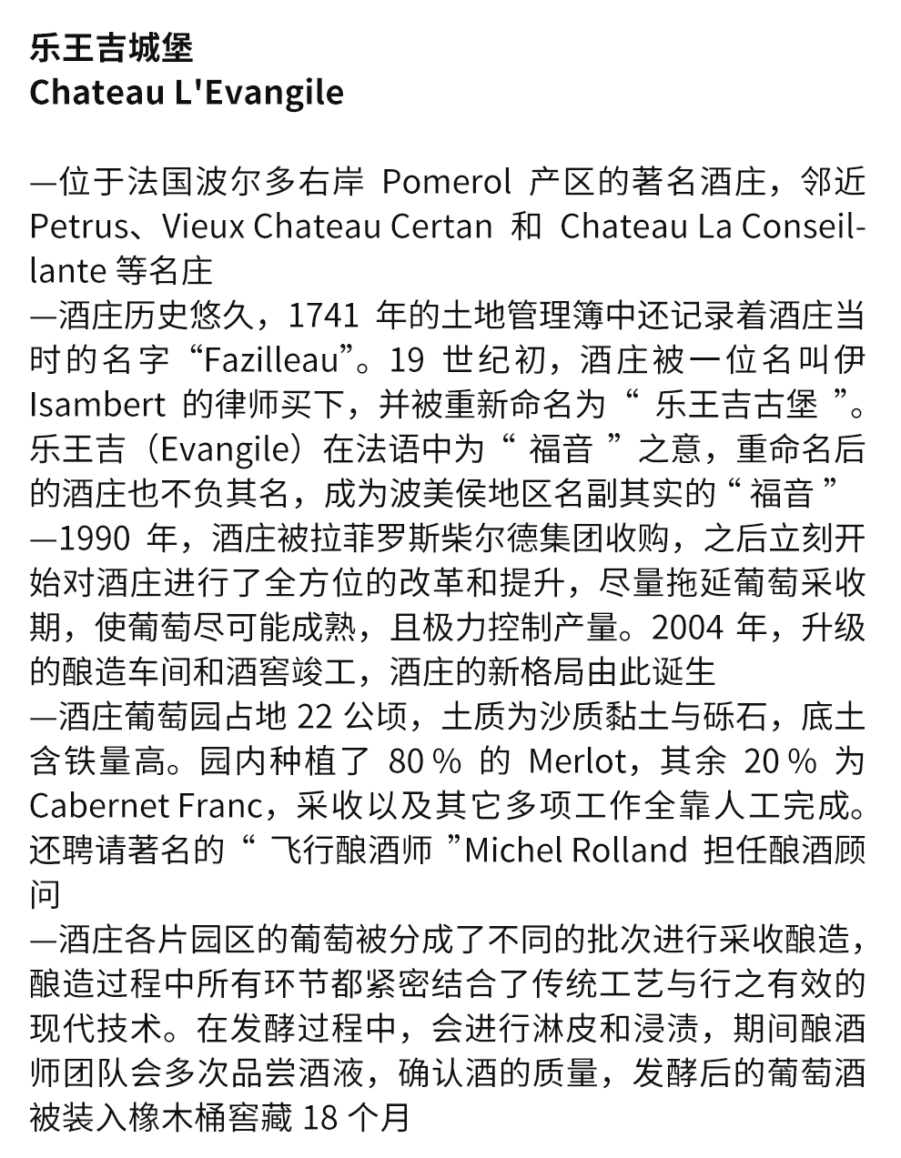 18世纪中叶,乐王吉城堡为利布恩市(Libourne)的雷格理兹(Leglise)家族所拥有。1741年的土地管理簿中还记录着城堡当时的名字——“法兹勒(Fazilleau)”。19世纪初,城堡被一位名叫伊桑贝尔(Isambert)的律师买下,并被重新命名为“乐王吉城堡”。乐王吉(Evangile)在法语中为“福音”之意,重命名后的城堡也不负其名,成为波美侯地区名副其实的“福音”。聘请著名的“飞行酿酒师”米歇尔·罗兰(Michel Rolland)担任酿酒顾问。