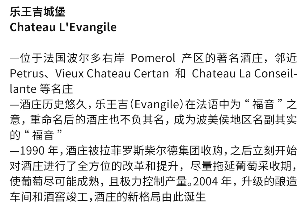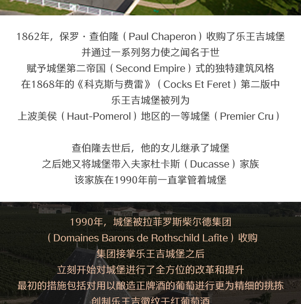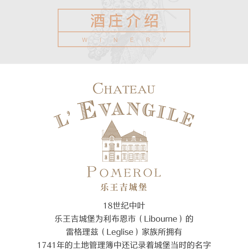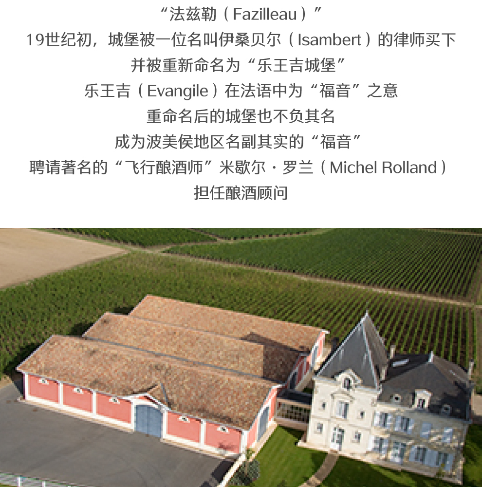 18世纪中叶,乐王吉城堡为利布恩市(Libourne)的雷格理兹(Leglise)家族所拥有。1741年的土地管理簿中还记录着城堡当时的名字——“法兹勒(Fazilleau)”。19世纪初,城堡被一位名叫伊桑贝尔(Isambert)的律师买下,并被重新命名为“乐王吉城堡”。乐王吉(Evangile)在法语中为“福音”之意,重命名后的城堡也不负其名,成为波美侯地区名副其实的“福音”。聘请著名的“飞行酿酒师”米歇尔·罗兰(Michel Rolland)担任酿酒顾问。