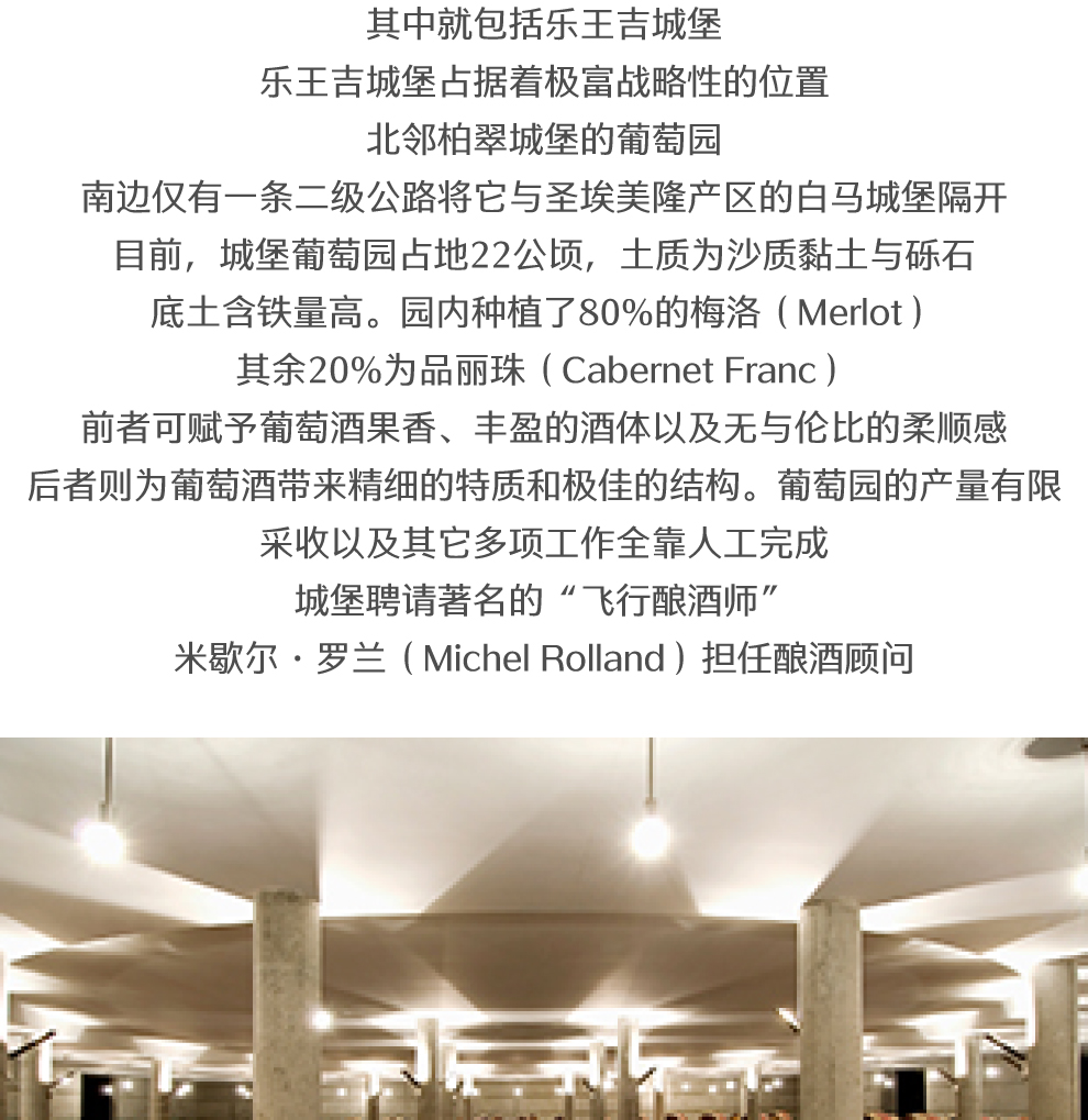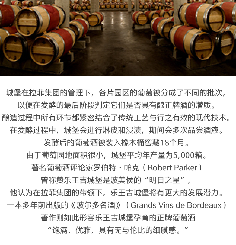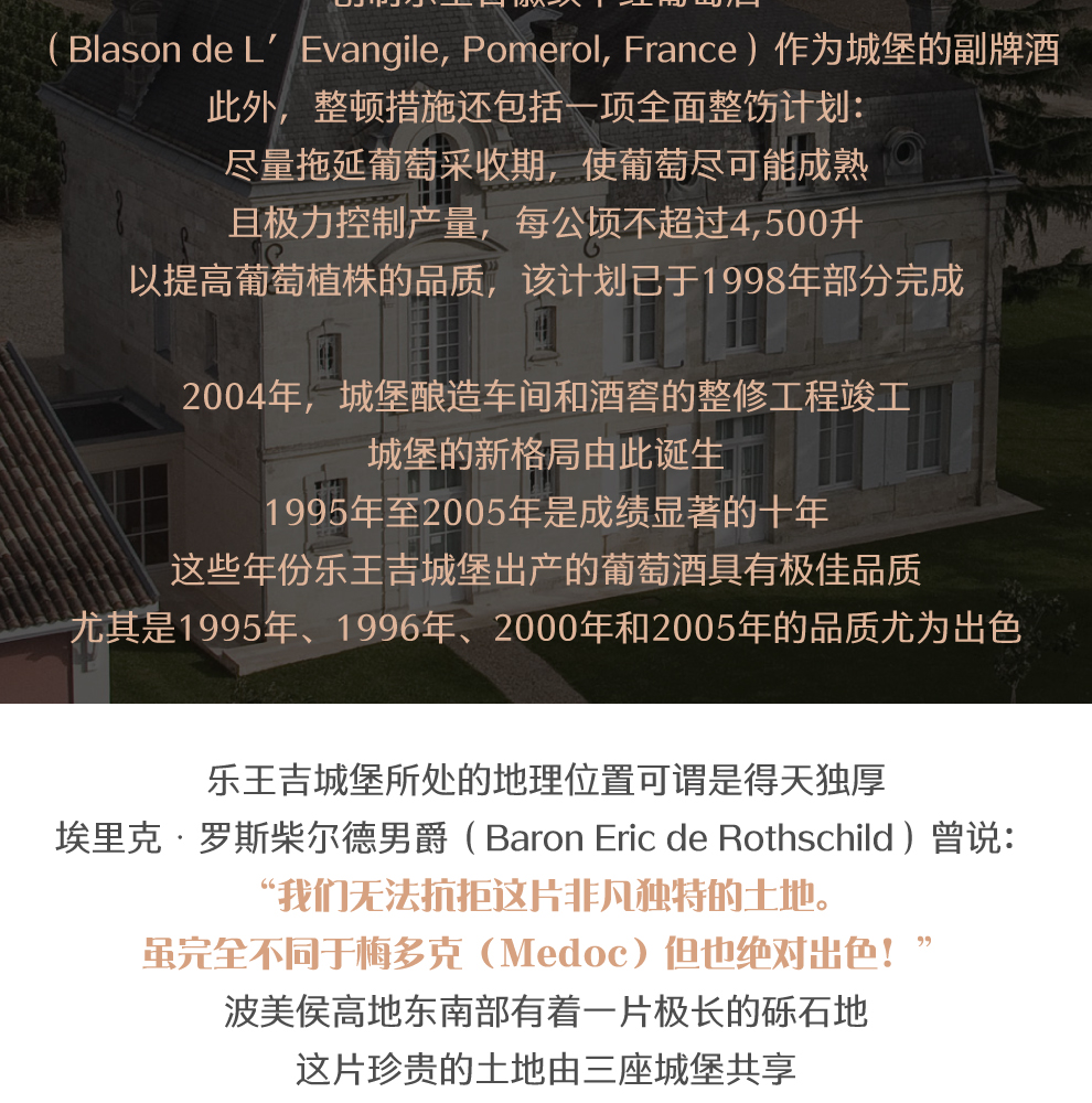 18世纪中叶,乐王吉城堡为利布恩市(Libourne)的雷格理兹(Leglise)家族所拥有。1741年的土地管理簿中还记录着城堡当时的名字——“法兹勒(Fazilleau)”。19世纪初,城堡被一位名叫伊桑贝尔(Isambert)的律师买下,并被重新命名为“乐王吉城堡”。乐王吉(Evangile)在法语中为“福音”之意,重命名后的城堡也不负其名,成为波美侯地区名副其实的“福音”。聘请著名的“飞行酿酒师”米歇尔·罗兰(Michel Rolland)担任酿酒顾问。