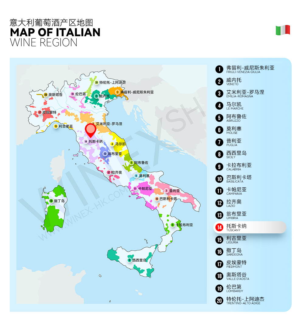 托斯卡纳是意大利最知名的明星产区,北邻艾米里亚-罗马涅(Emilia-Romagna),西北临利古里亚(Liguria),南接翁布利亚(Umbria)和拉齐奥(Latium),西靠第勒尼安海(Tyrrhenian Sea),地理位置优越。托斯卡纳之于意大利中部,好比波尔多之于法国。