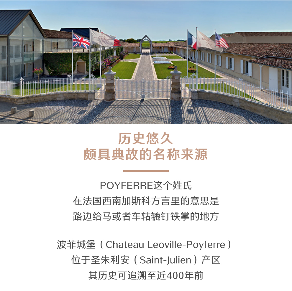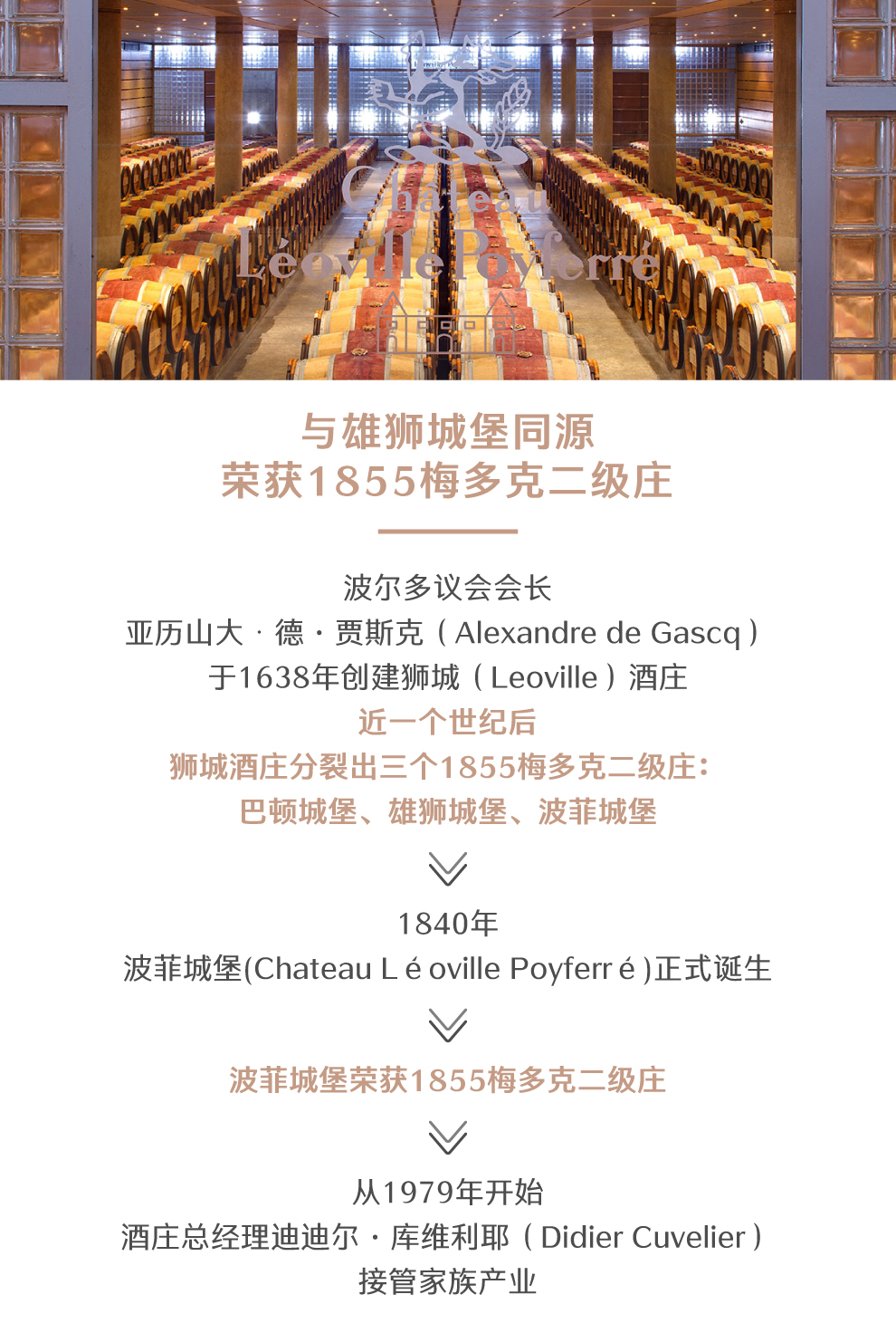 波菲的历史可以追溯到1638年。当时的狮城庄园(Château Léoville)是梅多克地区最大的酒庄。随着时间的推移和辈分的更迭,它逐渐分裂成几座不同的酒庄,1840年波菲酒庄(Château Léoville Poyferré)正式诞生,并在1855年葡萄酒分级中被评为二级列级酒庄。酒庄总经理迪迪尔.库维利耶先生(Didier Cuvelier)从1979年正式接管家族产业,管理酒庄事务。