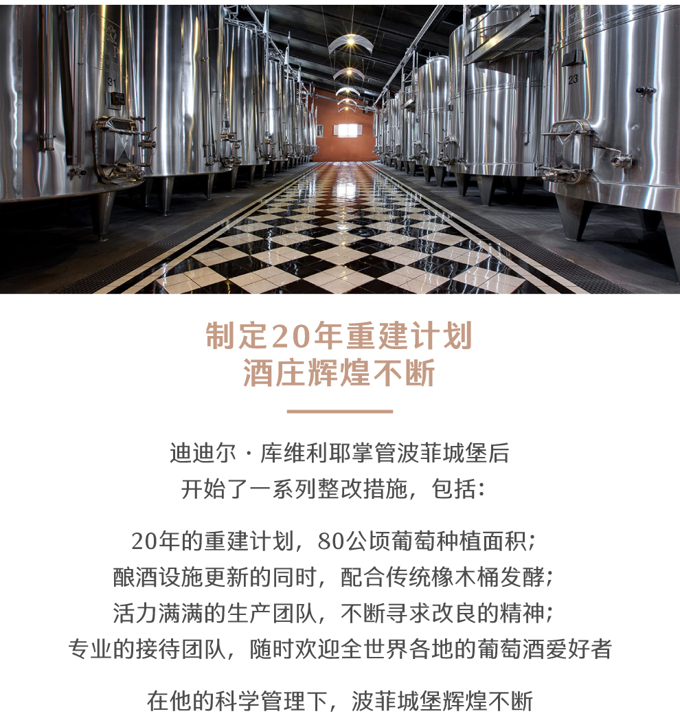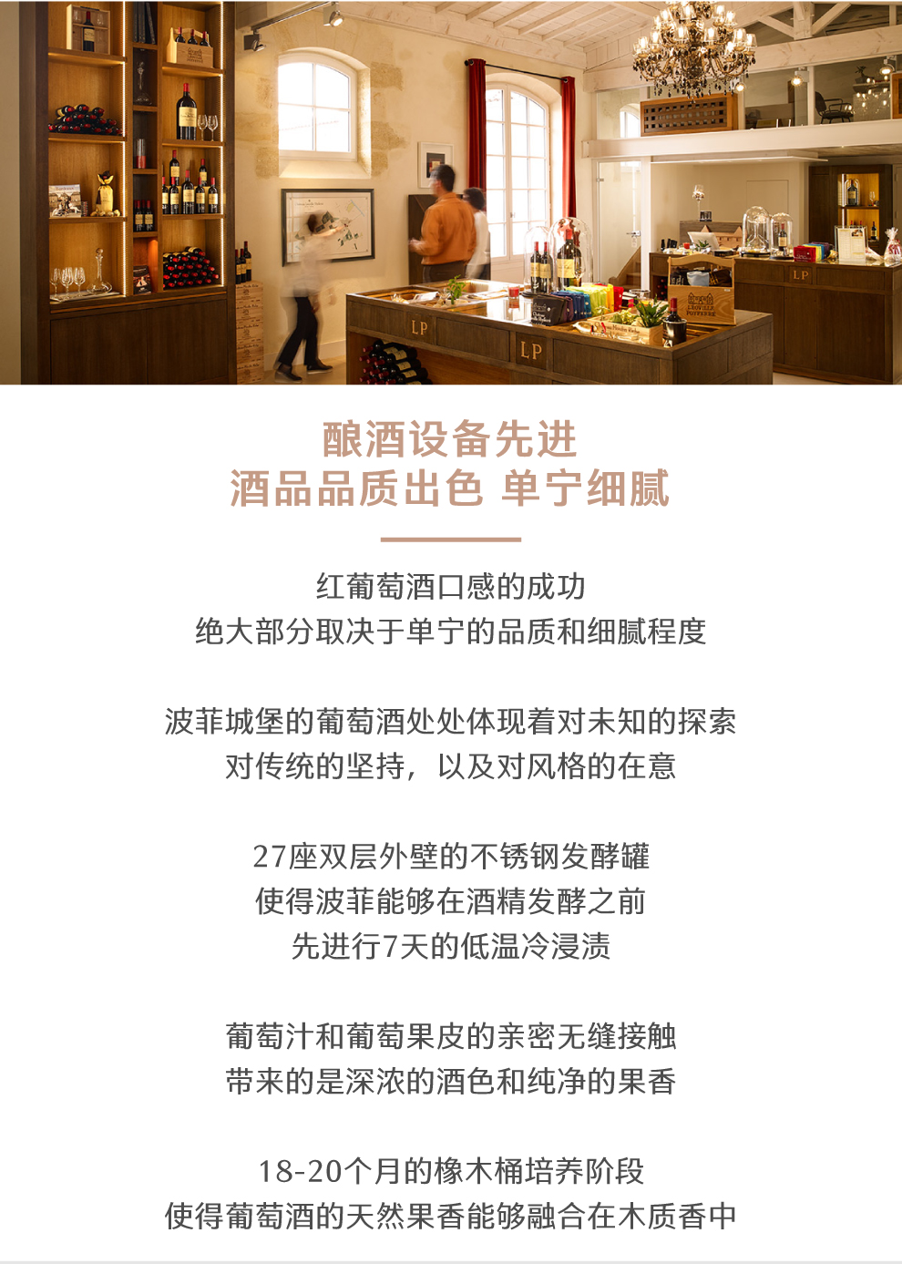 红葡萄酒口感的成功绝大部分取决于单宁的品质和细腻程度。波菲酒庄的葡萄酒酿造处处体现着对酿酒设备更新换代的探索、对传统高品质的坚持以及对葡萄酒出身风格的在意。27座双层外壁的不锈钢发酵罐使得我们能够在酒精发酵之前先进行7天的低温冷浸渍,葡萄汁和葡萄果皮的亲密无缝接触带来的是深浓的酒色和纯净的果香。18-20个月的橡木桶培养阶段,酿酒师精心选择的橡木桶使得葡萄酒的天然果香完美地融合在木质香中。波尔多最有名的飞翔酿酒师米歇尔.罗兰从1994年开始就成为酒庄的酿酒顾问,每年都会对葡萄酒酿造和调配两个阶段提出自己的建议。
