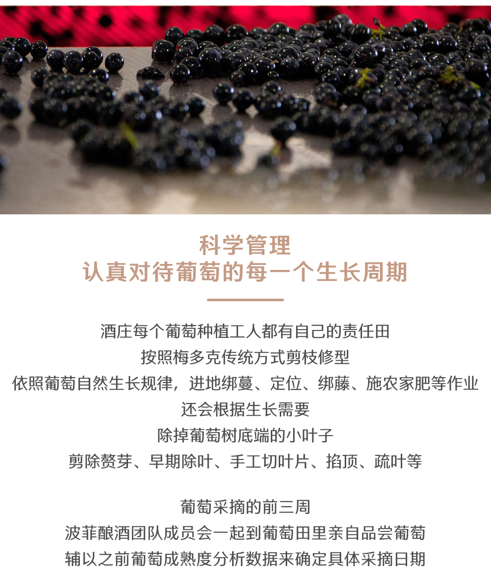 在对的时间做对的决定葡萄采摘之前的三周,波菲酿酒团队成员:总经理迪迪尔.库维利耶、酿酒顾问米歇尔.罗兰(Michel Rolland),酒庄酿酒师伊莎贝拉. 达文(Isabelle Davin),葡萄种植主管布鲁诺.克里尼(Bruno Clenet),和酒窖主管迪迪尔.托曼(Didier Thomann)会一起到葡萄田里亲自品尝葡萄,辅以之前葡萄成熟度分析数据来确定具体采摘日期。