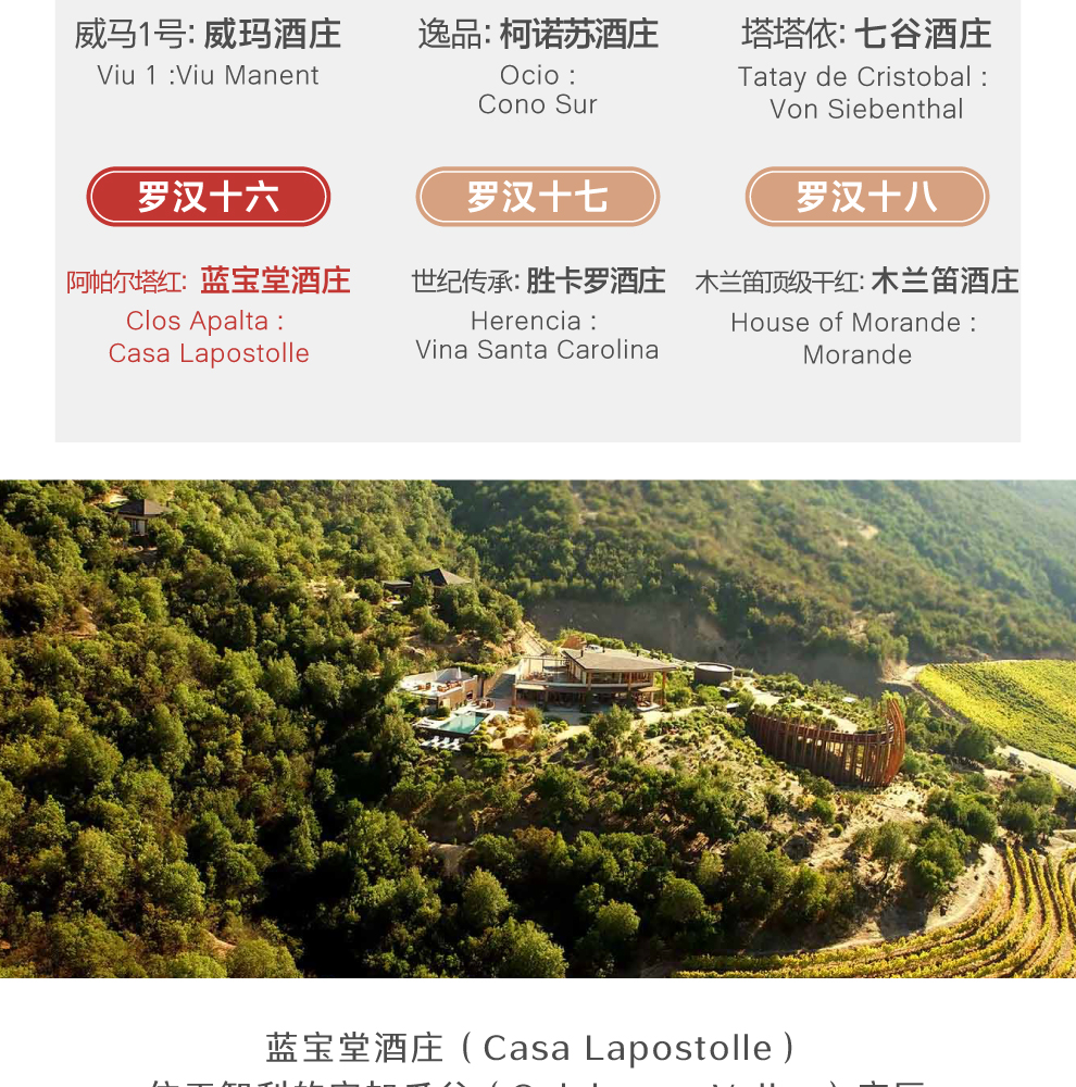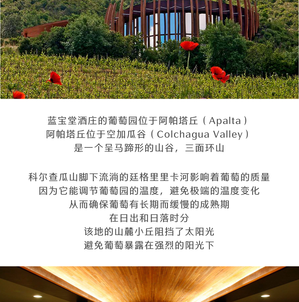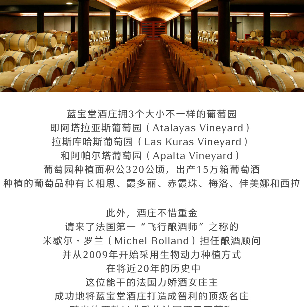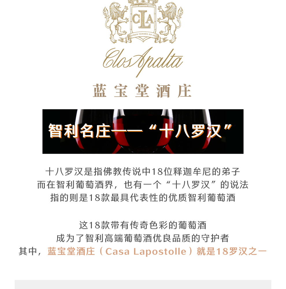 作为智利高端葡萄酒品牌的典型代表Clos Apalta 蓝宝堂将智利的野性活力和法国的优雅浪漫做了完美的结合,创造出世界一流品质的葡萄酒。 蓝宝堂酒庄位于科尔查瓜山谷的阿帕塔丘,创建于1994年,她的第一个年份来自于1997年。在酒庄成立的二十年时间里,曾10次入选《葡萄酒观察家》“全球百大” 葡萄酒单,其中2005年份获得“全球百大”葡萄酒第一名。2014年份和2015年份又连续两次获得James Sucling 100分的荣耀,所有的品质与荣誉使得蓝宝堂迅速跻身智利“四大酒王”的宝座。