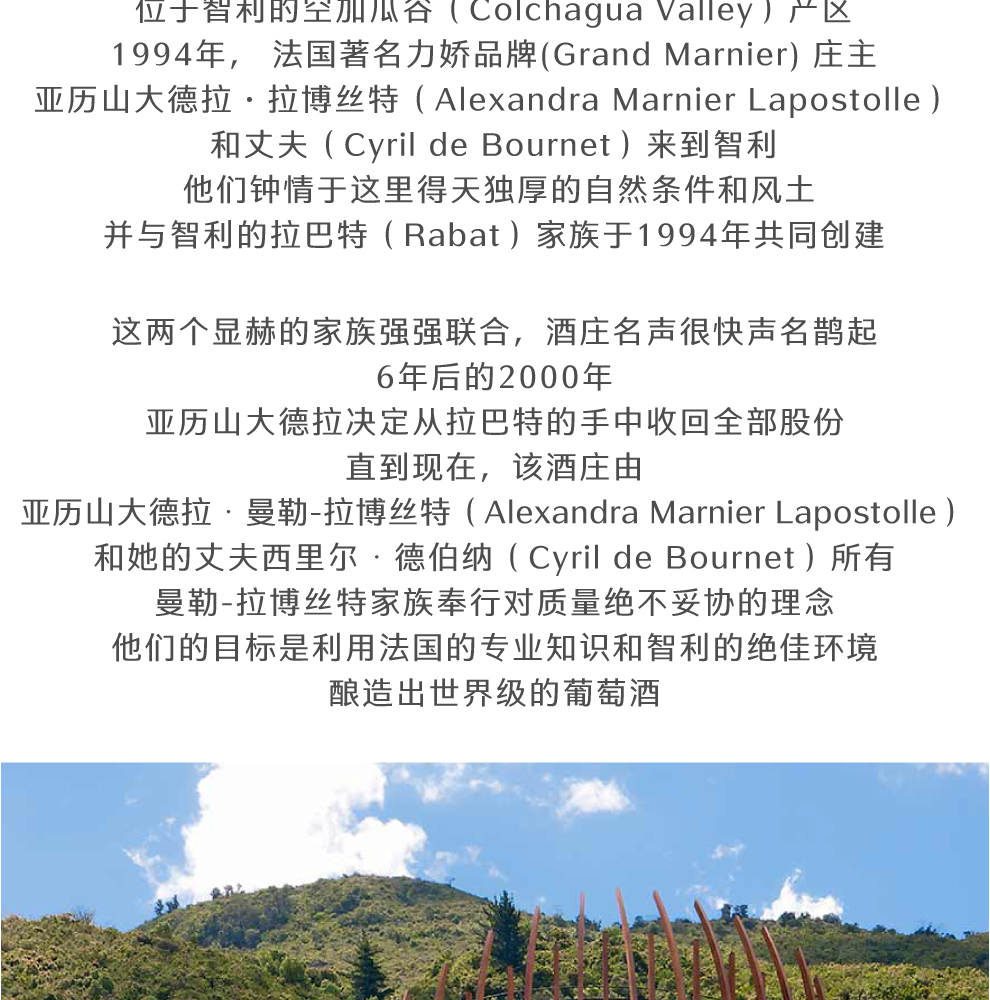 作为拉博丝特家族( Marnier L apostolle Family)的第七代传人一查理斯 .德.伯纳德( Charles De BOURNET) -直秉承家族几代人从事葡萄种植和酿造工作。结合法国的精湛技艺和智利近乎完美的葡萄栽培条件酿造出世界级的葡萄酒。作为这个荣耀家族的传人,查理斯从父母那里继承了勤勉严谨的工作态度和甘于奉献、勇于开创的精神。
