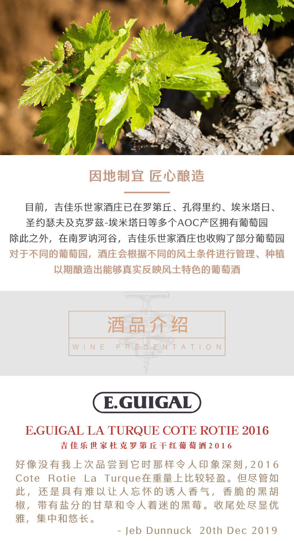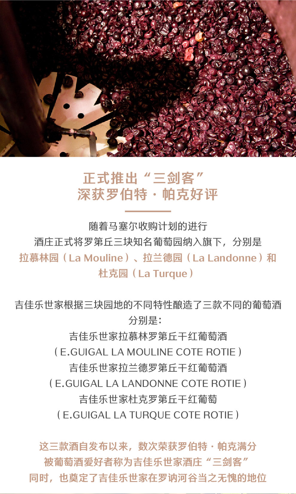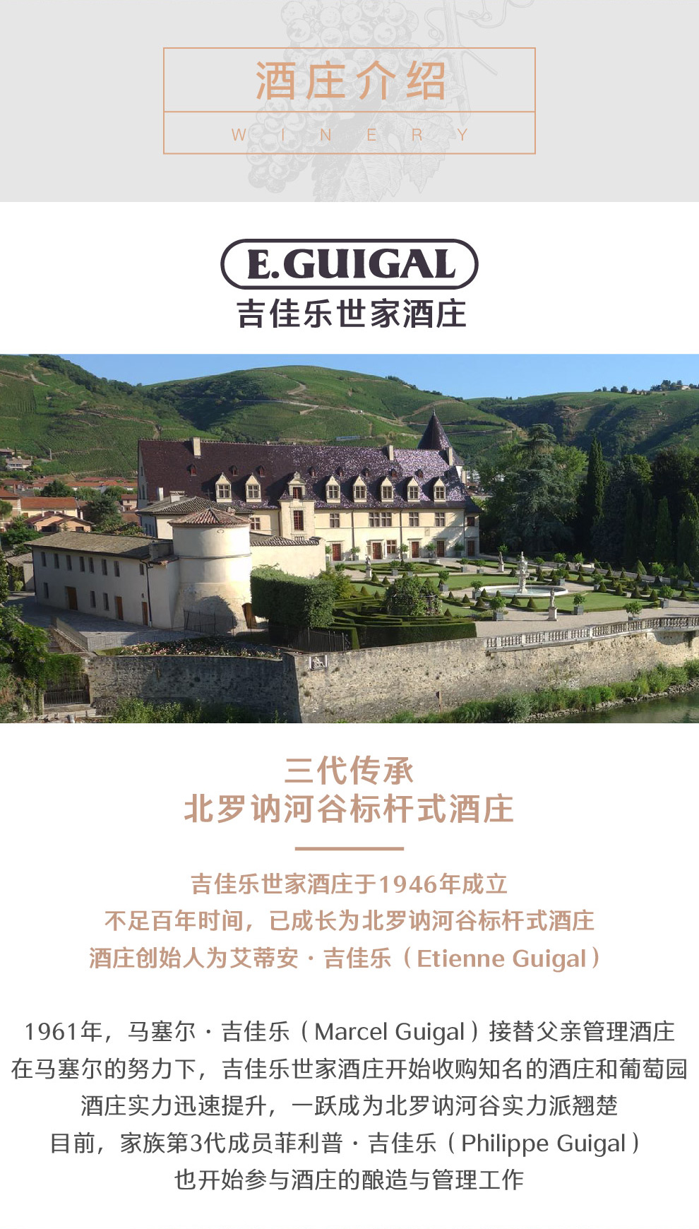 吉佳乐世家酒庄(E. Guigal)是罗第丘(Cote-Rotie)最富盛名,也是最重要的酒庄。1946年,艾蒂安•吉佳乐(Etienne Guigal)在罗第丘的酿酒中心阿布斯村(Ampuis)创建了该酒庄。阿布斯村历史悠久,其葡萄园已有超过2,400年的历史,至今仍保留着罗马时代的建筑物。1923年,14岁的艾蒂安•吉佳乐来到这里。他决定投身于酿酒业,一干就干了67年多。在1961年,年轻的马塞尔•吉佳乐(Marcel Guigal)接替了父亲管理酒庄。在马塞尔的努力下,吉佳乐世家酒庄开始收购一些知名的酒庄,实力不断提升。现在,该家族的第3代成员菲利普•吉佳乐(Philippe Guigal)担任着该酒庄的酿酒师,与伯尔纳德(Bernadette)、马塞尔(Marcel)一起构成酒庄的核心力量。