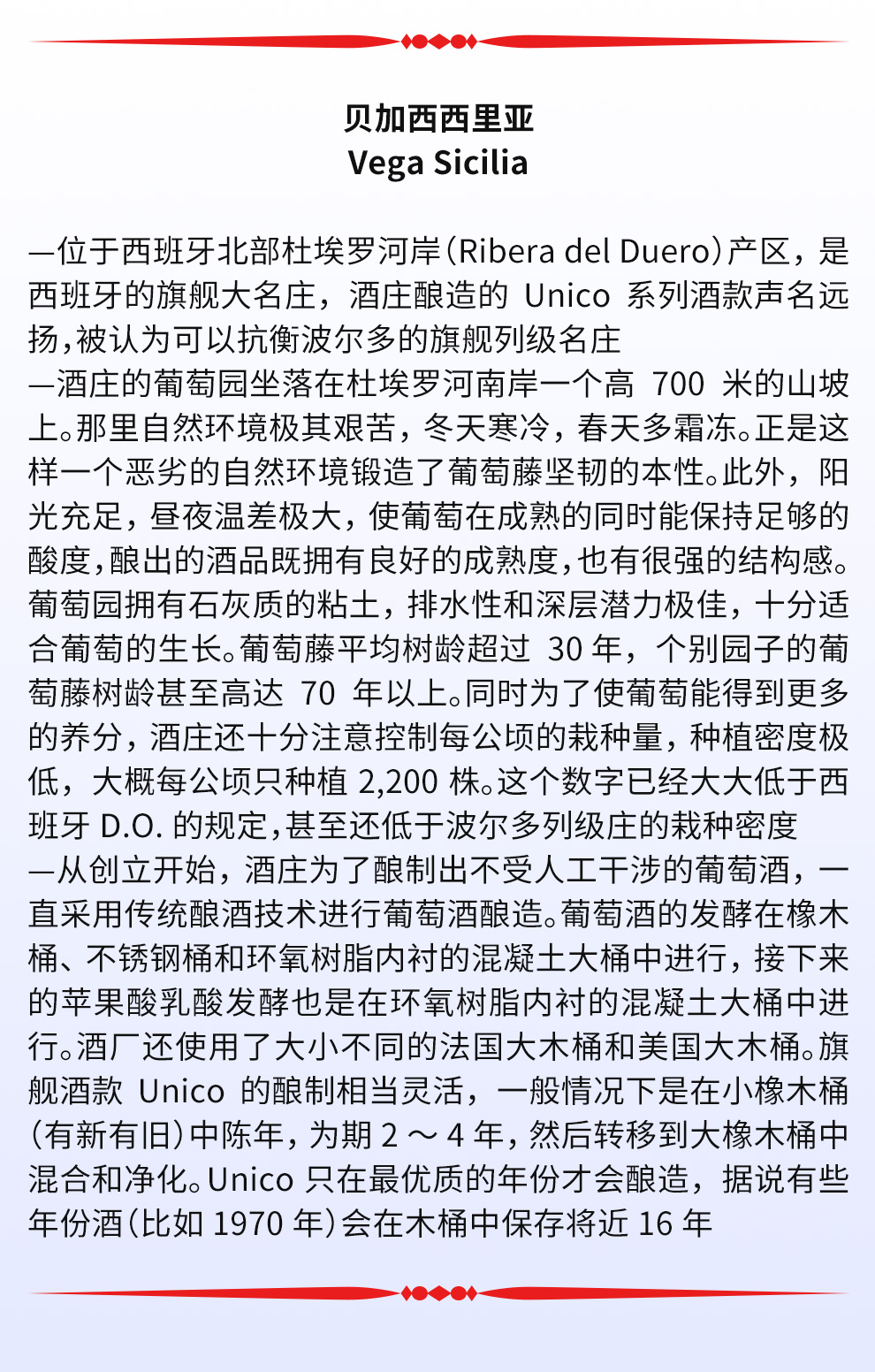 贝加西西里亚酒庄位于西班牙杜埃罗河岸(Ribera del Duero),有着一百五十多年的历史,在西班牙乃至全世界都享有盛誉。贝加西西里亚酒庄被称为西班牙的“酒王”,其酒款经常获得国际性的大奖并出现在全球的名酒拍卖会中。
