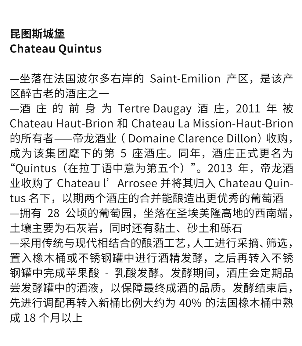 城堡原名道卡伊(Tertre Daugay),2011年5月被波尔多酒业巨头克兰斯帝龙酒业( Domaine Clarence Dillon)集团收购后,更名为 “昆图斯城堡”(Chateau Quintus).