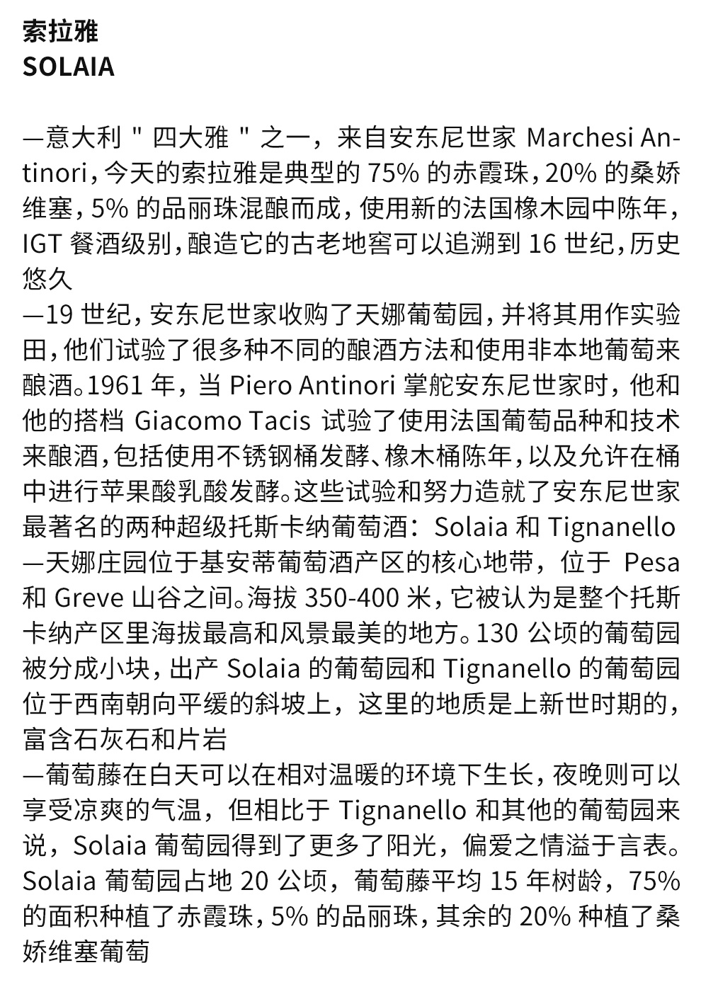 ANTINORI旗下 SOLAIA(索拉雅)和 TIGNANELLO(天娜)两个高端品牌的品质可以与法国顶级名庄酒媲美, SOLAIA(索拉雅)1997 年份酒,被全球最权威的美国《葡萄酒观察家》杂志评为 2000 年全球“百大葡萄酒”的第一名,也是第一个获得此荣誉的意大利葡萄酒,一举确立了 SOLAIA 在全球顶级葡萄酒中的领袖地位。改变了全球红酒爱好者意大利少出顶级酒的认知,提升了意大利葡萄酒在全球市场的地位。