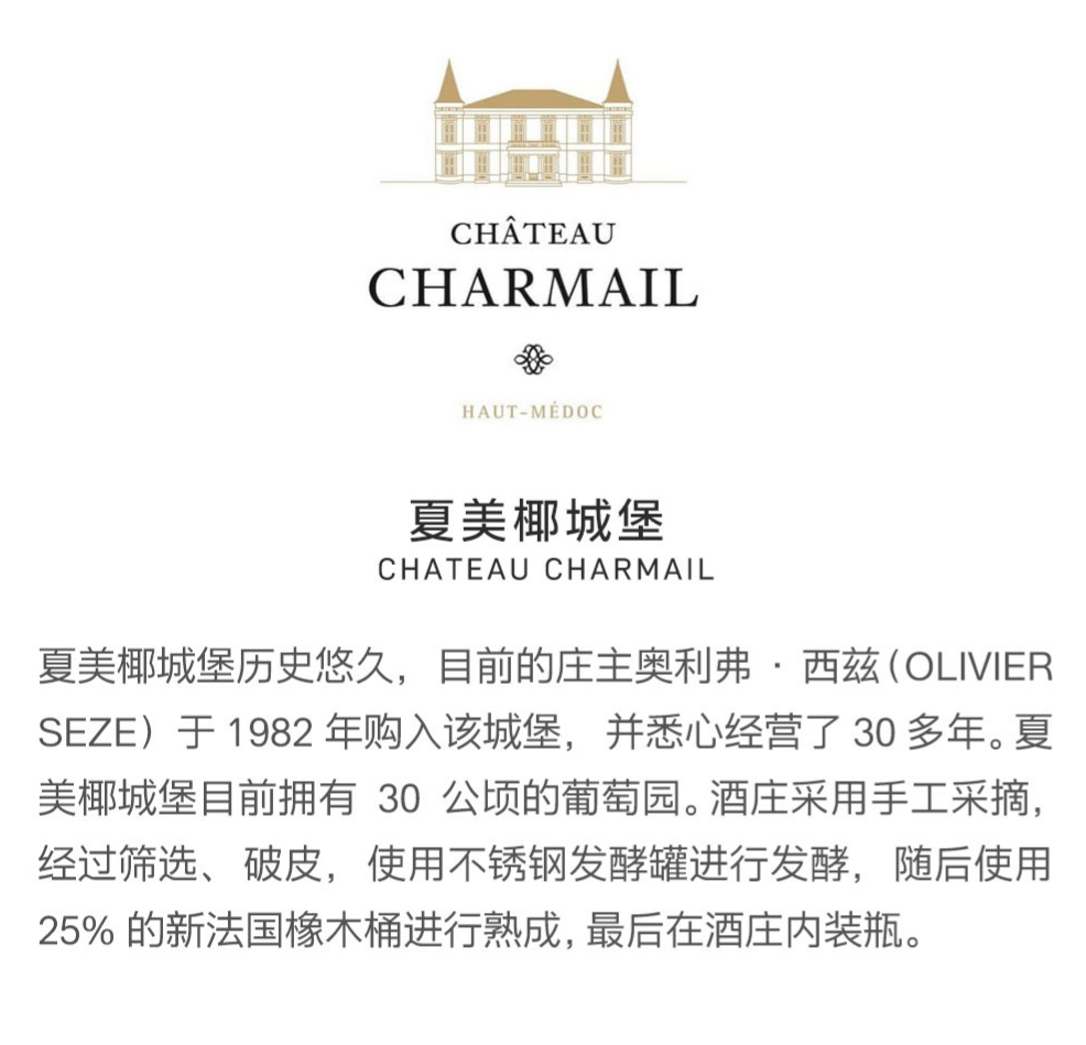 夏美椰城堡历史悠久,其名字来源于16世纪著名的贵族家庭特里维·夏美椰(Trevey de Charmail)家族的名字。18世纪初期,夏美椰城堡酿造的葡萄酒名声开始逐步提高。酒庄的历史从1982年开始,那一年奥利弗·西兹(Olivier Seze)购得此酒庄,并悉心经营了30年,以酿制口感均衡的葡萄酒见长。2008年,伯纳德·阿吕安(Bernard Halluin)怀着对葡萄酒的无限热情来到了酒庄,与奥利弗共同掌管酒庄。