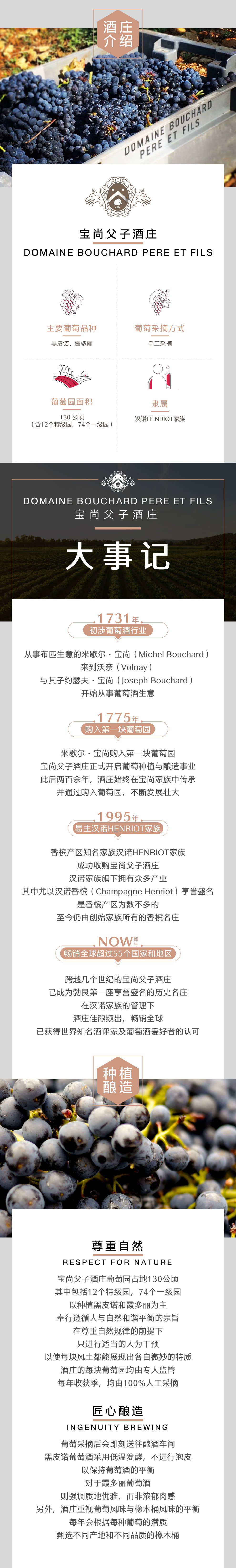 宝尚父子酒庄的历史要从1731年说起,这一年,从事布匹生意的米歇尔•宝尚(Michel Bouchard)来到沃尔内(Volnay),与其儿子约瑟夫•宝尚(Joseph Bouchard)开始从事葡萄酒生意。