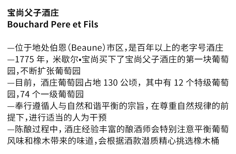 1998年,汉诺家族收购了拥有近百公顷葡萄园,年产量达33,004箱的葡萄酒公司,并出乎意料地一改从前葡萄酒浓重的橡木味风格,转而生产充满清新纯净果味的葡萄酒。目前酒庄的庄主是汉诺家族的约瑟夫•汉诺(Joseph Henriot),在这位庄主的专业管理下,宝尚父子葡萄酒的品质与产量得到了不断的提升。如今,在全世界超过55个国家都可以看到宝尚父子酒庄出品的葡萄酒, 它们向世界展示了来自勃艮第的黑皮诺(Pinot Noir)与霞多丽(Chardonnay)酿制的葡萄酒是多么神奇的美酒。