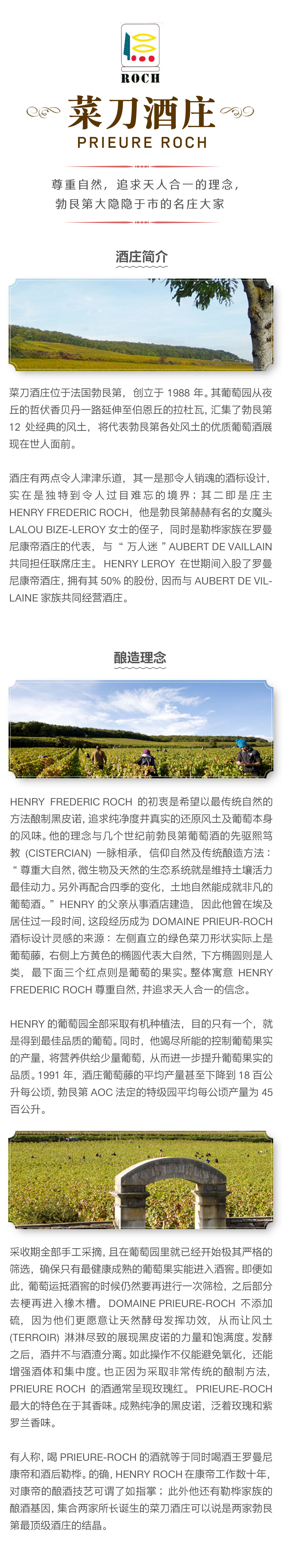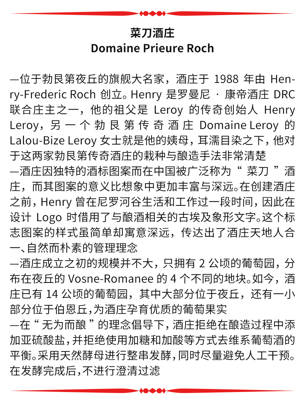 有人称,喝Prieure-Roch的酒就等于同时喝酒王罗曼尼康帝和酒后勒桦。的确,Henry Roch在康帝工作数十年,对康帝的酿酒技艺可谓了如指掌;此外他还有勒桦家族的酿酒基因,集合两家所长诞生的菜刀酒庄可以说是两家勃艮第最顶级酒庄的结晶。