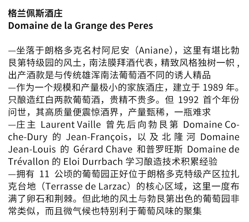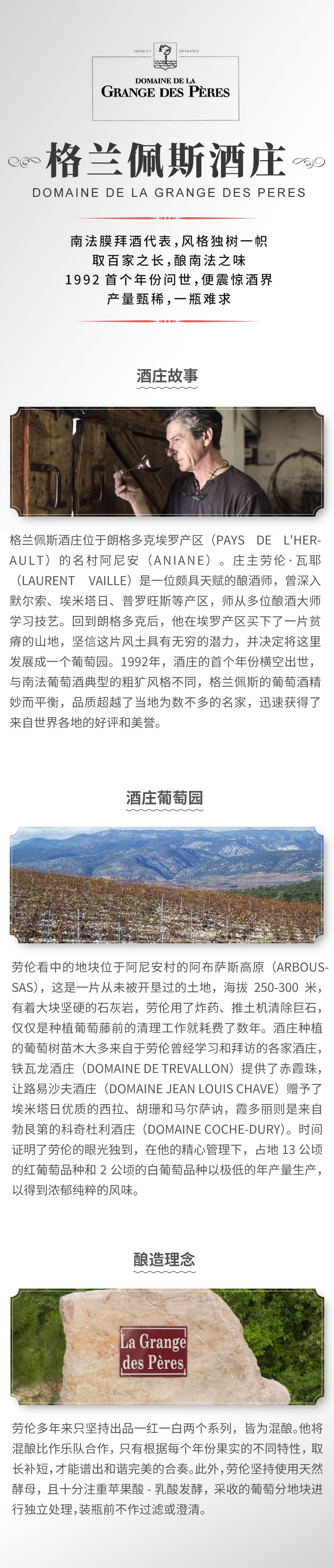 格兰佩斯酒庄位于朗格多克埃罗产区(PAYS DE L'HERAULT)的名村阿尼安(Aniane)。庄主劳伦·瓦耶(Laurent Vaille)是一位颇具天赋的酿酒师,曾深入默尔索、埃米塔日、普罗旺斯等产区,师从多位酿酒大师学习技艺。回到朗格多克后,他在埃罗产区买下了一片贫瘠的山地,坚信这片风土具有无穷的潜力,并决定将这里发展成一个葡萄园。1992年,酒庄的首个年份横空出世,与南法葡萄酒典型的粗犷风格不同,格兰佩斯的葡萄酒精妙而平衡,品质超越了当地为数不多的名家,迅速获得了来自世界各地的好评和美誉。