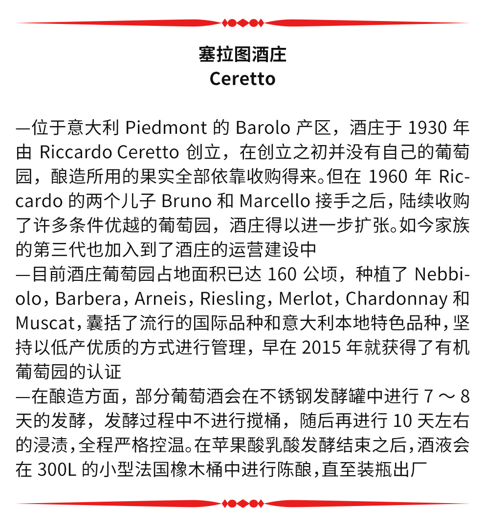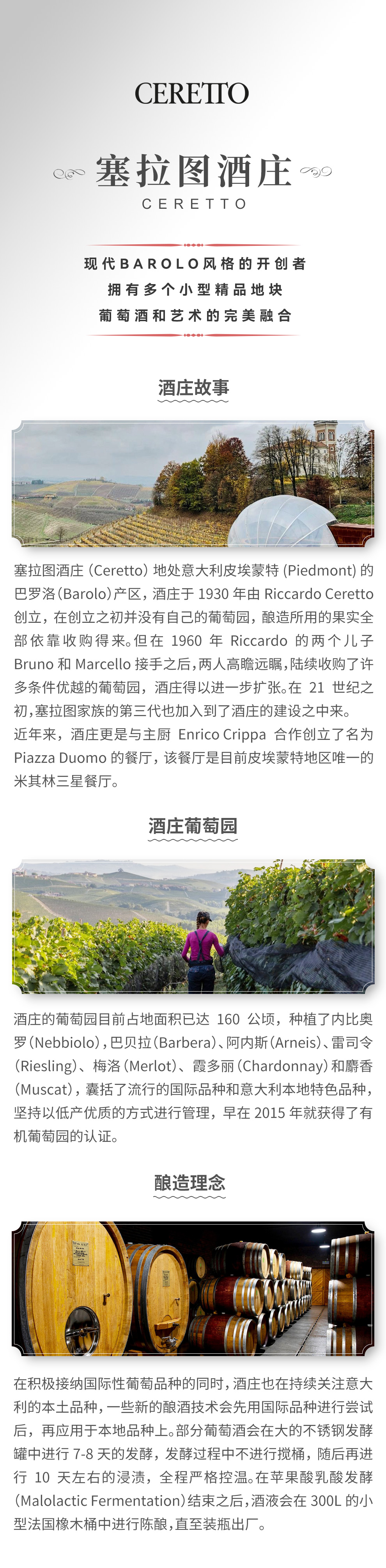 塞拉图酒庄(Ceretto)地处意大利皮埃蒙特(Piedmont) 的巴罗洛(Barolo)产区,酒庄于1930年由Riccardo Ceretto创立,在创立之初并没有自己的葡萄园,酿造所用的果实全部依靠收购得来。但在1960年Riccardo的两个儿子Bruno和Marcello接手之后,两人高瞻远瞩,陆续收购了许多条件优越的葡萄园,酒庄得以进一步扩张。在21世纪之初,塞拉图家族的第三代也加入到了酒庄的建设之中来。