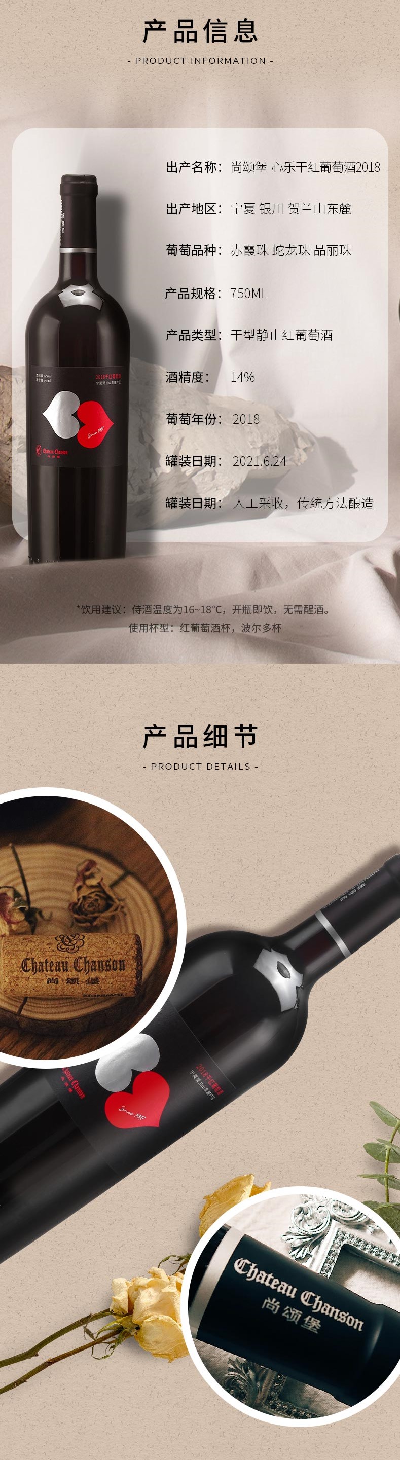 人工采收后逐粒精选,去梗破碎后使用气囊压榨机进行轻柔压榨,并采取冷浸渍的方式以保留醉新鲜的果香和醉活泼的酸度,随后在大的不锈钢桶内选用特定酵母进行温控发酵,并用旧的法国橡木桶熟成3个月。