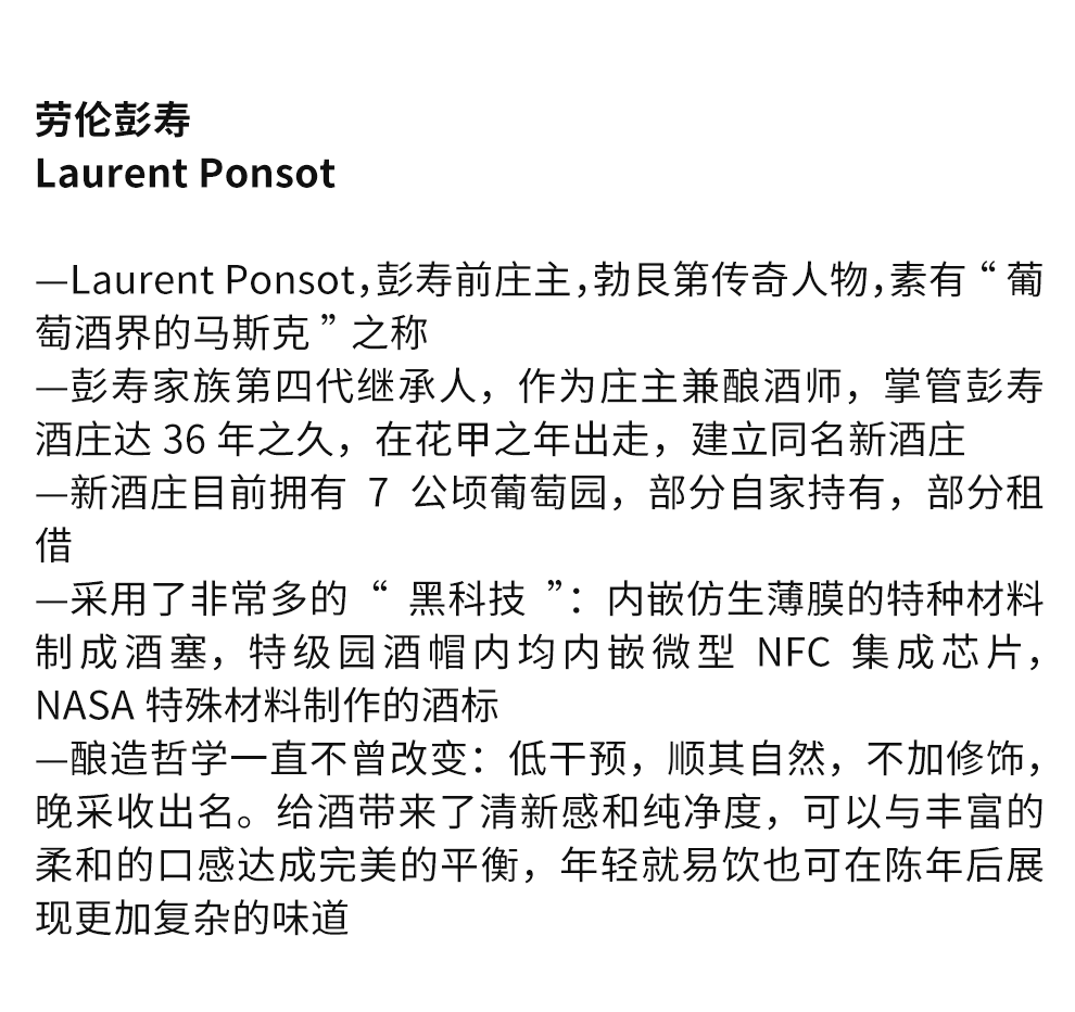 劳伦彭寿(Laurent ponsot)的负责人为劳伦彭寿先生,他曾经在勃艮第著名的彭寿酒庄(Domaine Ponsot)担任庄主。