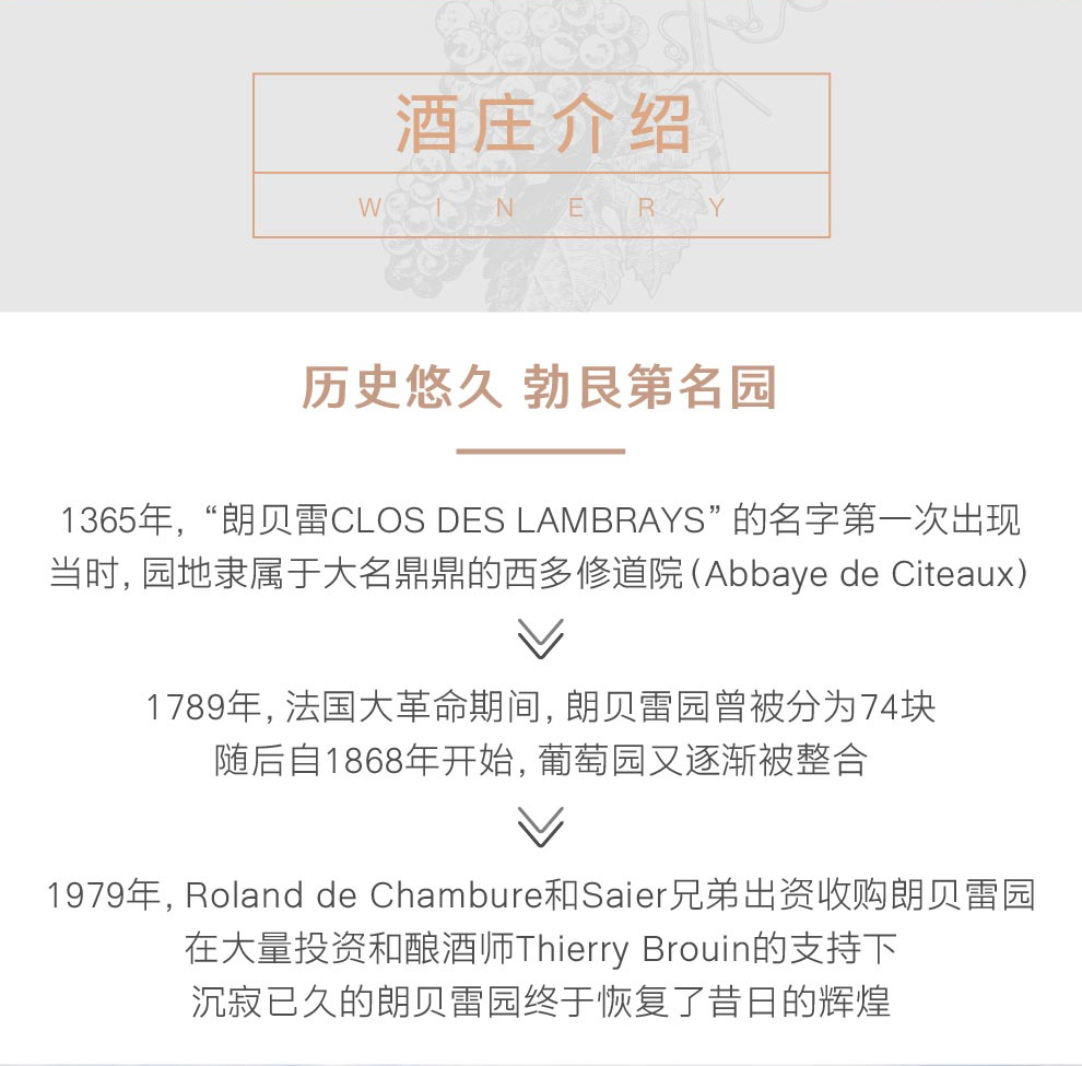 人们第一次看到朗贝雷这个名字是在1365年,当时一个名为Citeaux 的修道院名下的一块葡萄田叫“朗贝雷园”。
