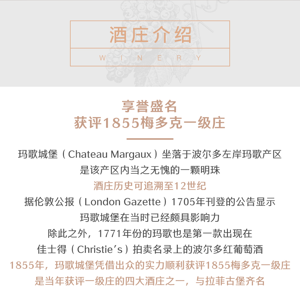 在波尔多的五大顶级酒庄中,玛歌堡的独特之处如同其城堡一样,是一种优雅迷人与气势磅礴的完美结合,其出产的产品均品质兼优,只要一上市常常被抢购一空。