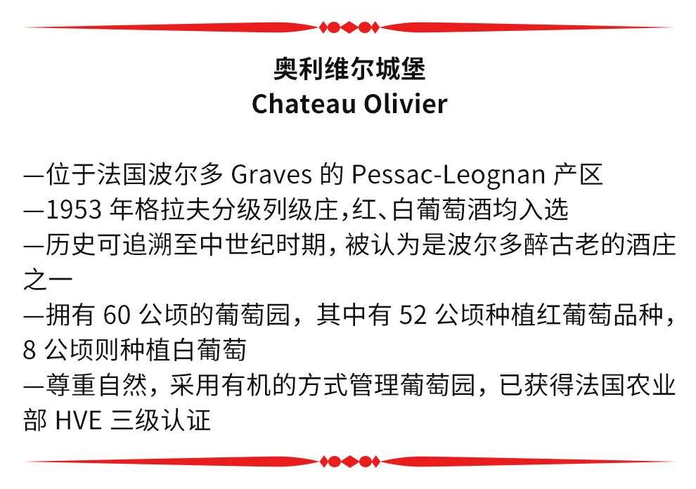 奥利维尔城堡(Chateau Olivier)位于法国波尔多格拉夫(Graves)产区内的佩萨克-雷奥良(Pessac-Leognan)子产区。1953年,格拉夫分级制度正式确立,共有16座列级庄(Crus Classes de Graves)入选。其中红、白葡萄酒双栖的仅有6座,而奥利弗城堡正是其中之一,可谓是格拉夫产区的佼佼者。